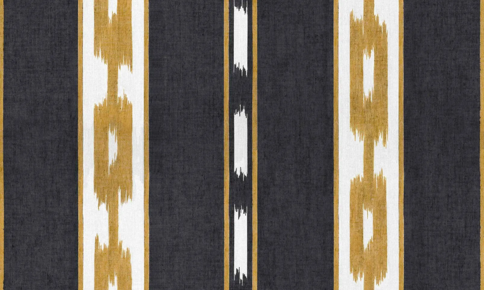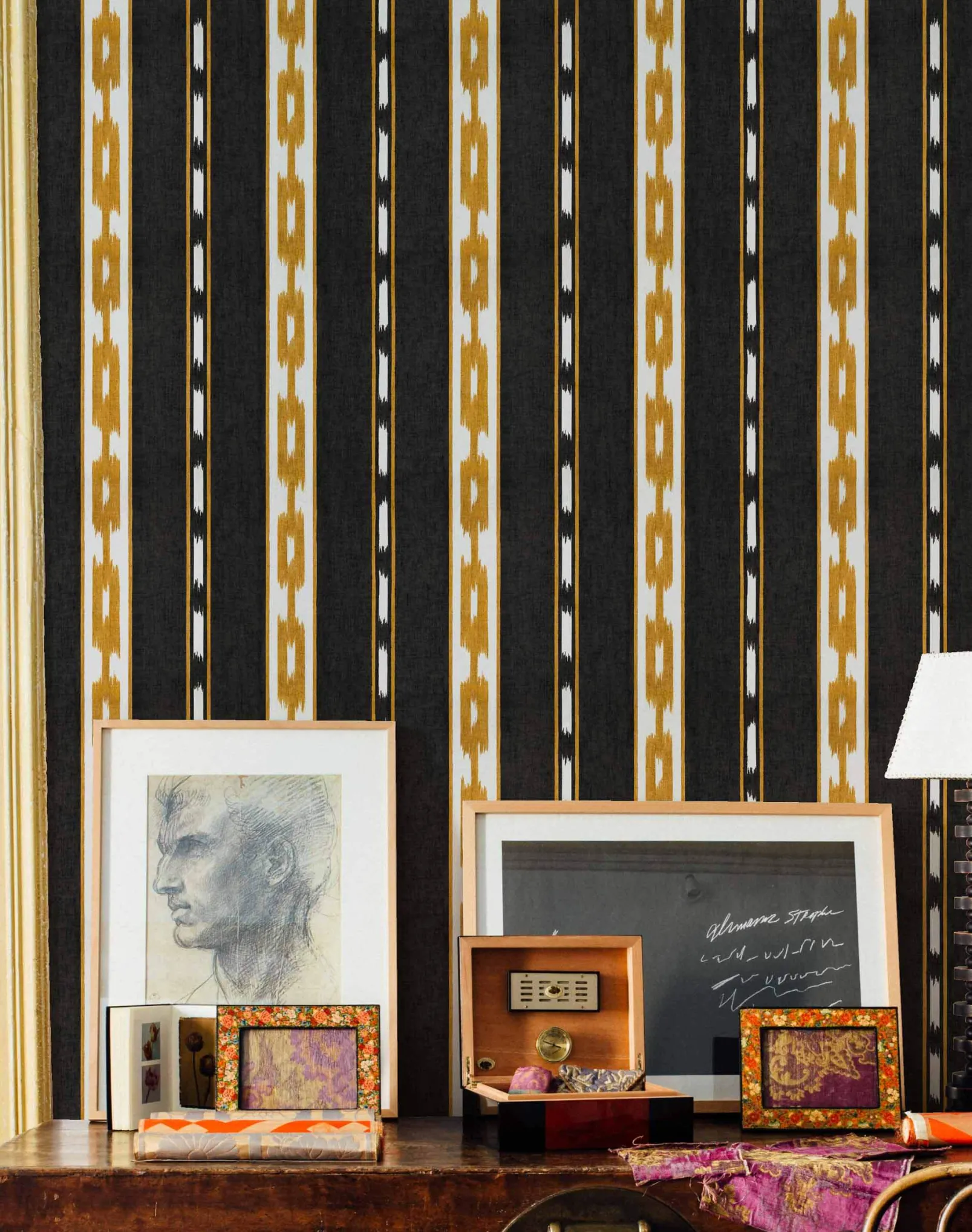 El papel pintado Kente Black de Coordonné es un diseño de rayas en tonos negros. Túnicas confeccionadas para la realeza Akan con tiras de algodón.