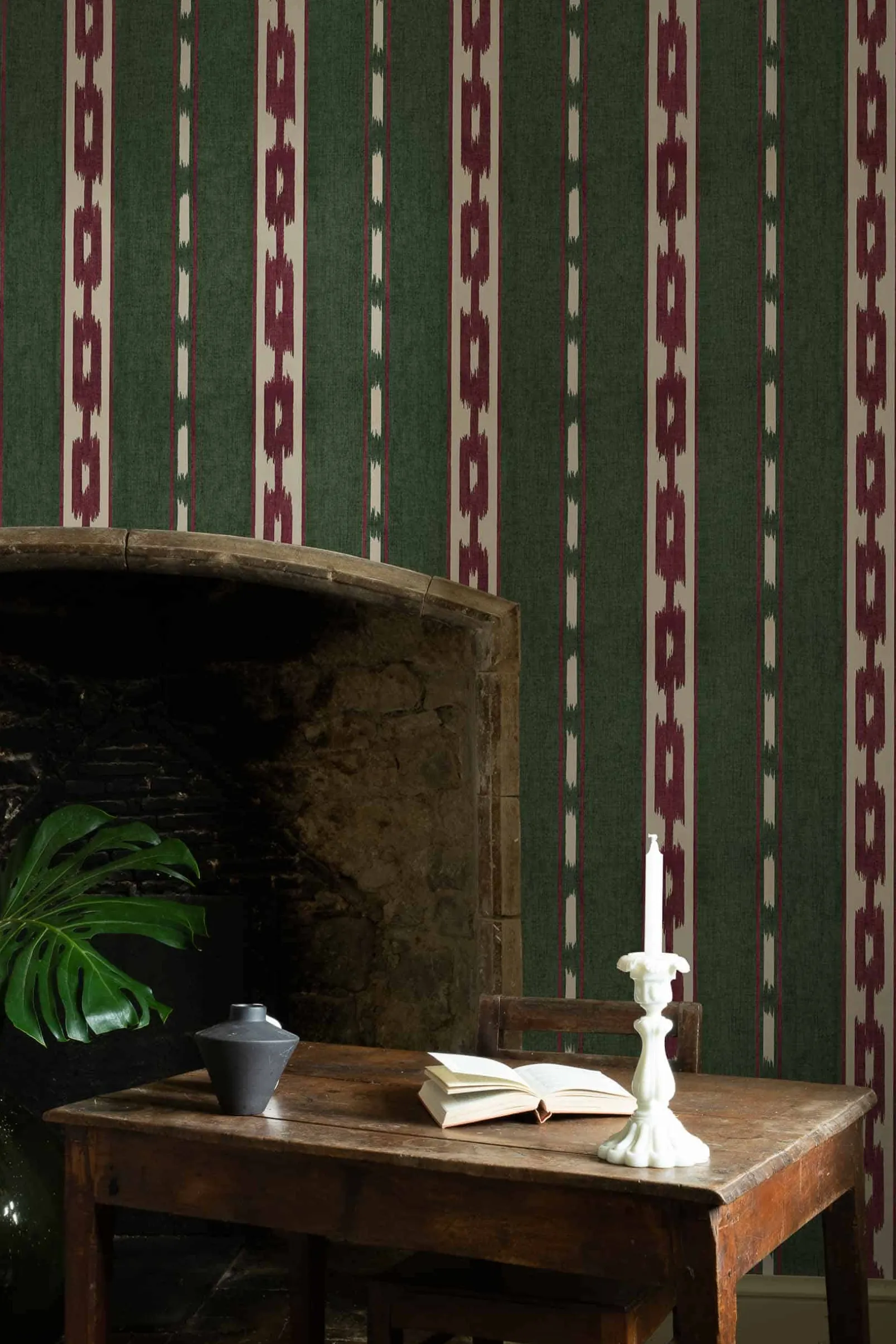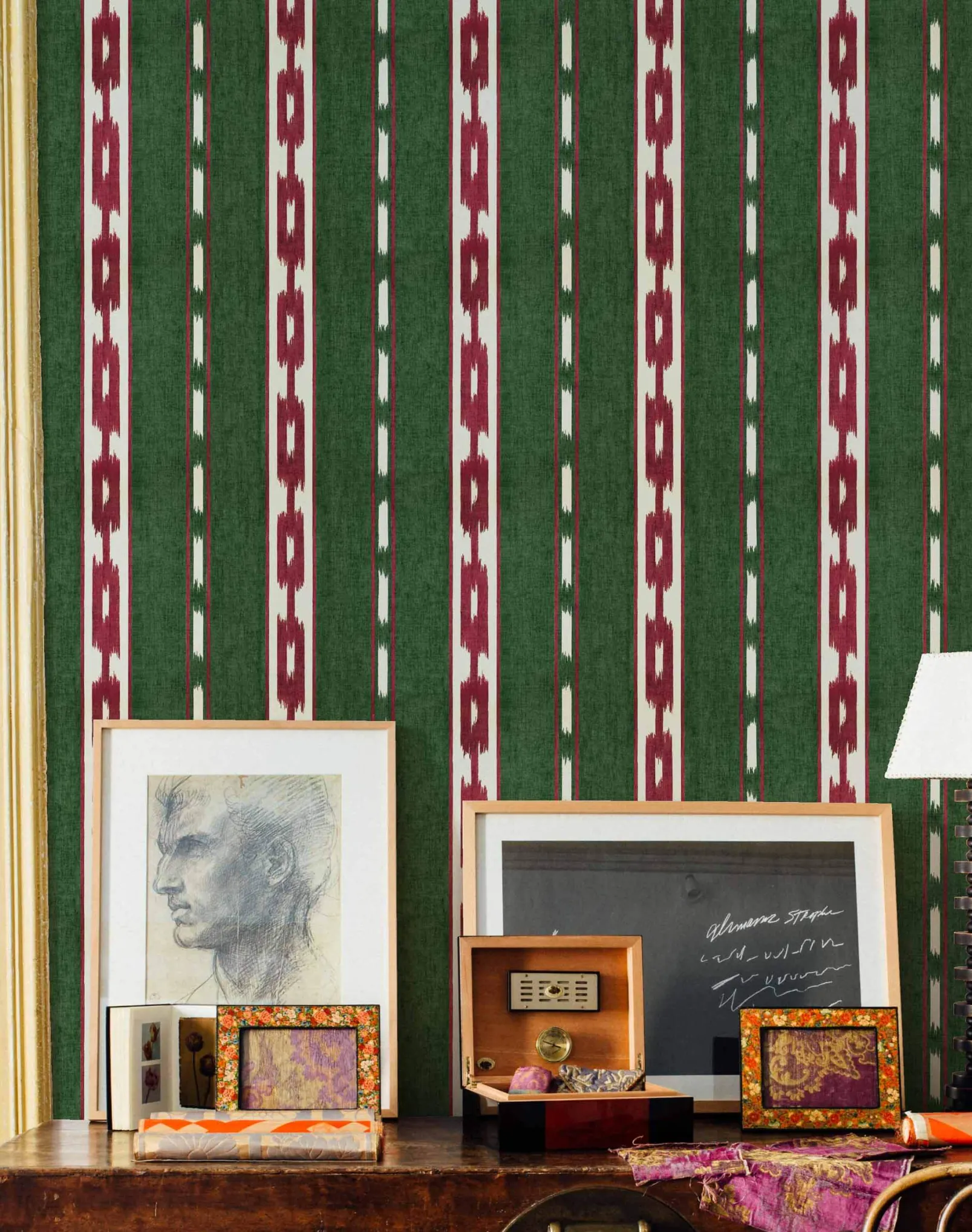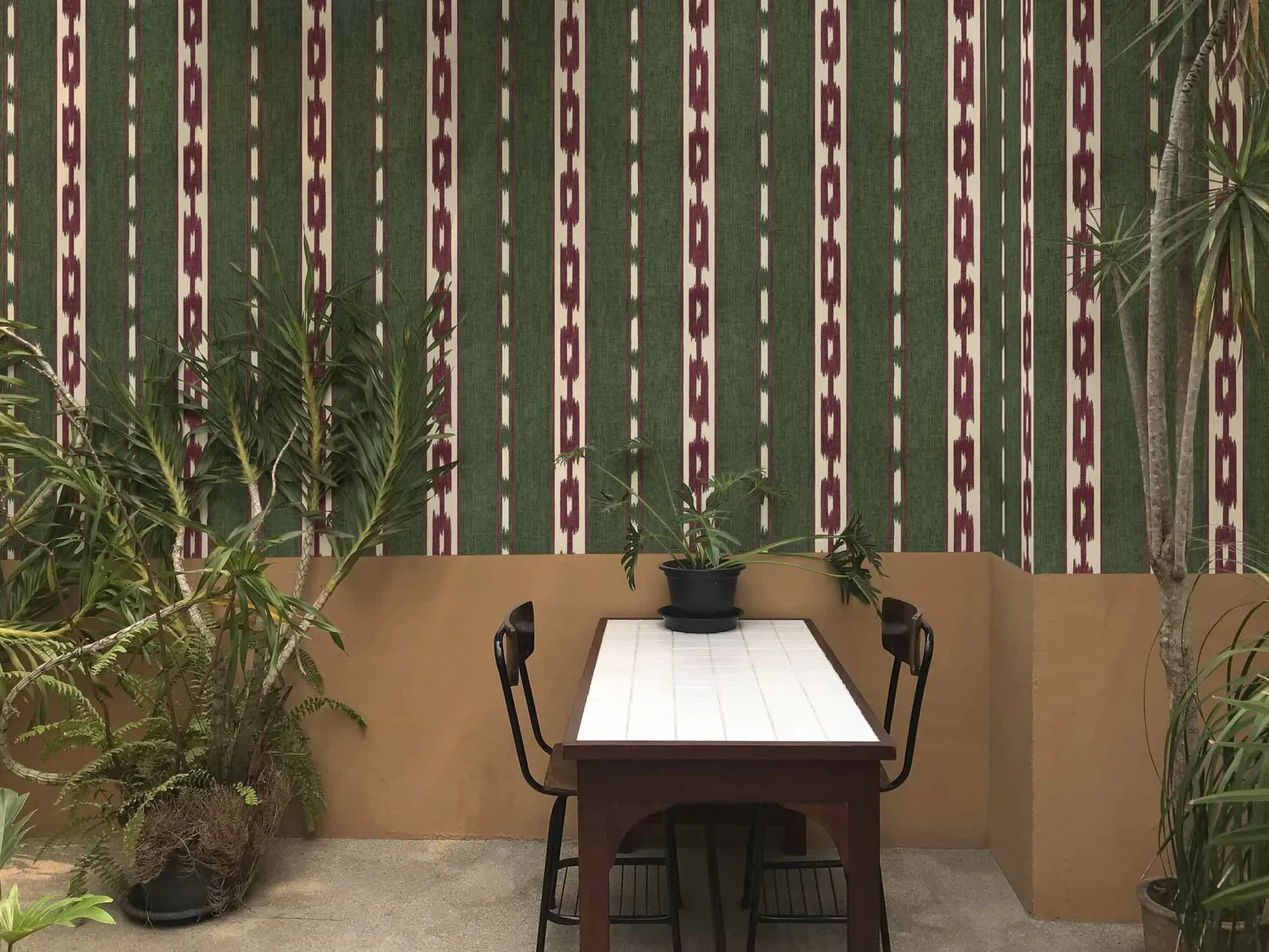 El papel pintado Kente Green de Coordonné es un diseño de rayas en tonos verdes. Túnicas confeccionadas para la realeza Akan con tiras de algodón.