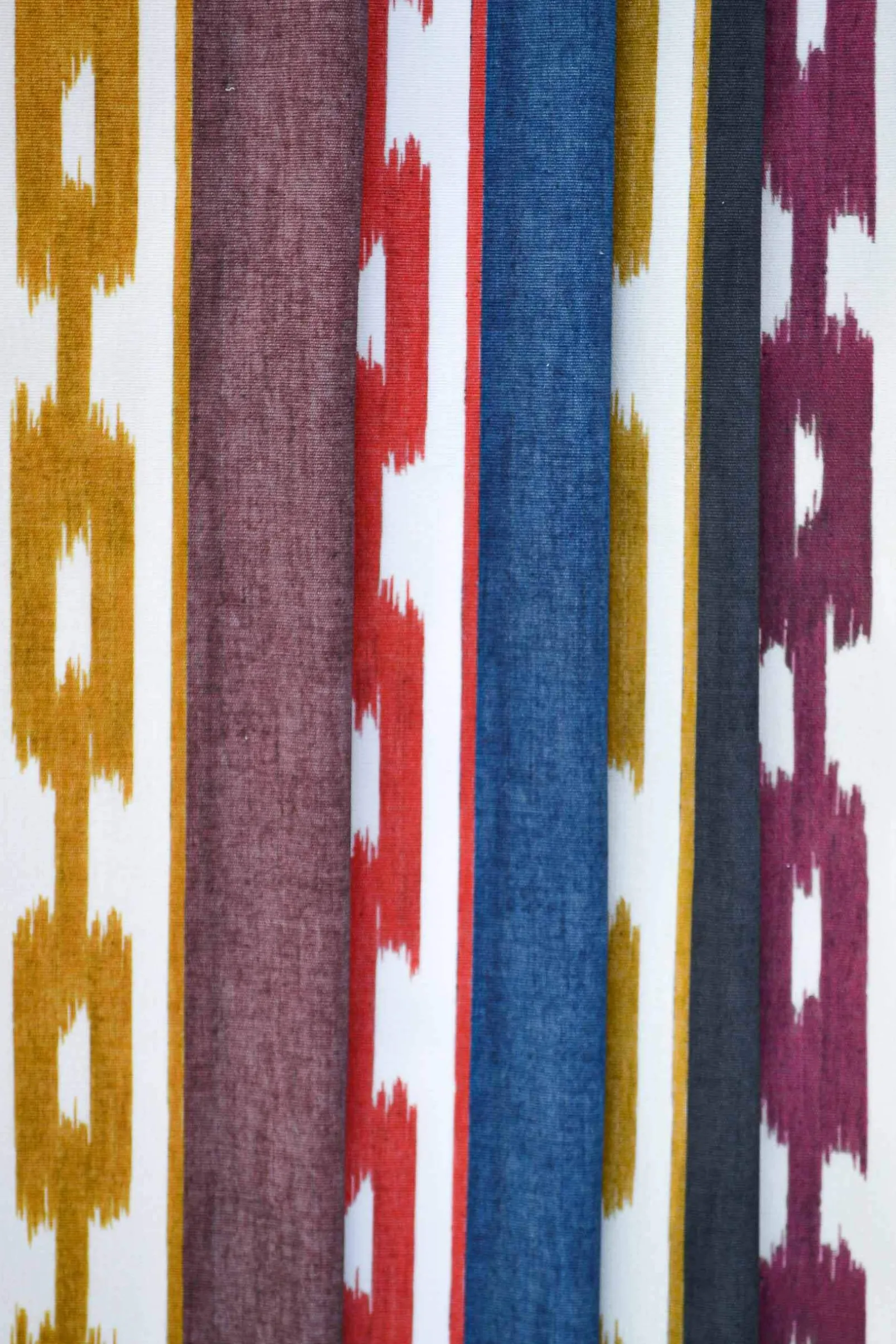 El Kente Wine de Coordonné es un diseño de rayas en tonos rojo/vino de la colección Ikart Outdoor. Túnicas confeccionadas para la realeza Akan con tiras de algodón.