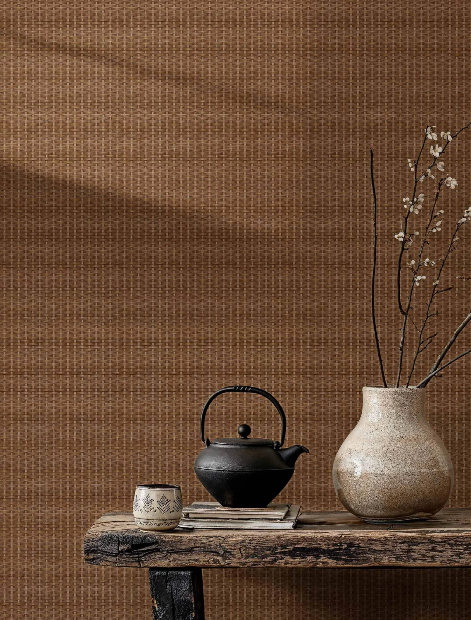 Kuba Raffia Honey de Coordonne es un papel pintado inspirado en la textura en tonos marrones de la colección Berber. Diseño intrincado de tiras estrechas de rafia extraída de hojas de palmera.