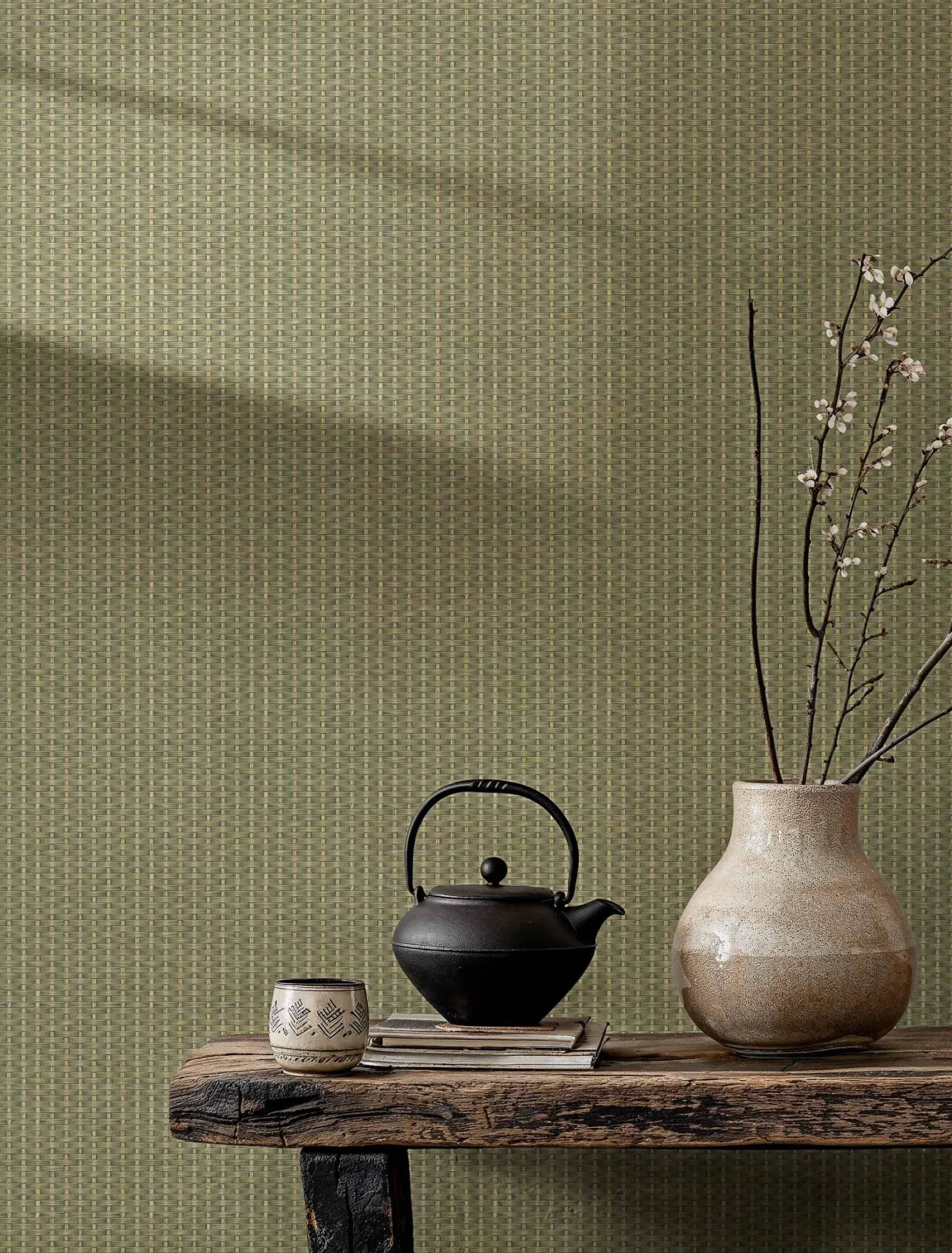 Kuba Raffia Leaves de Coordonne es un papel pintado inspirado en la textura en tonos verdes de la colección Berber. Diseño intrincado de tiras estrechas de rafia extraída de hojas de palmera.