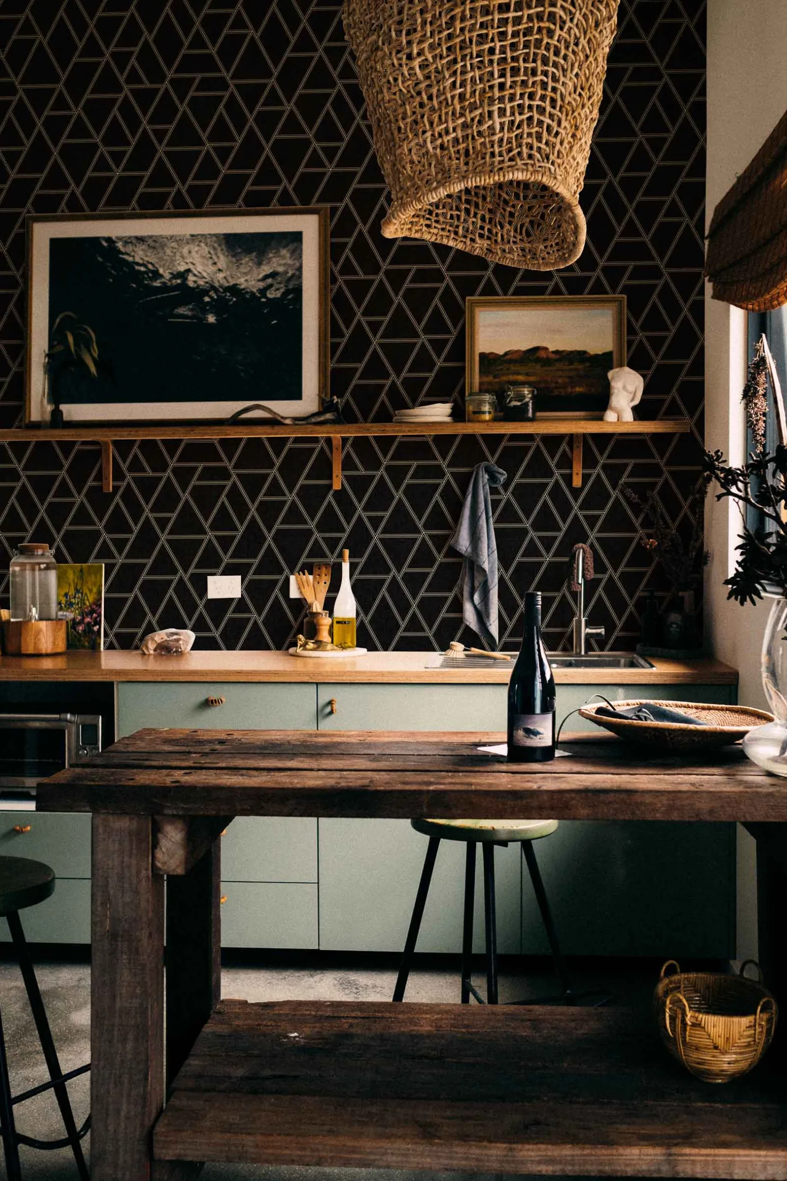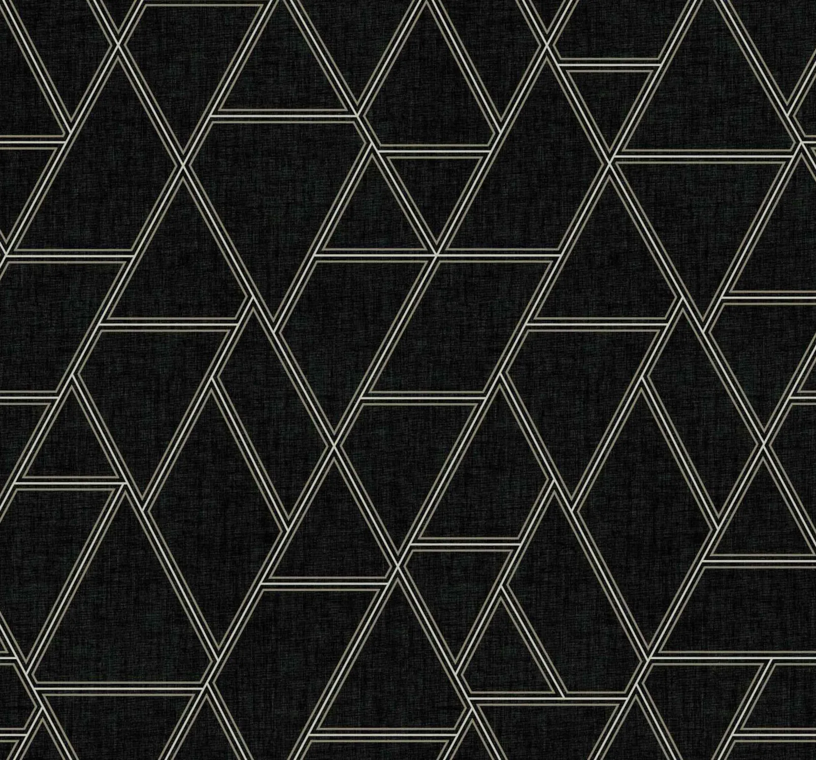 El papel pintado Labyrinth Onix de Coordonné es un diseño geométrico en tonos negros de la colección Enchanted.