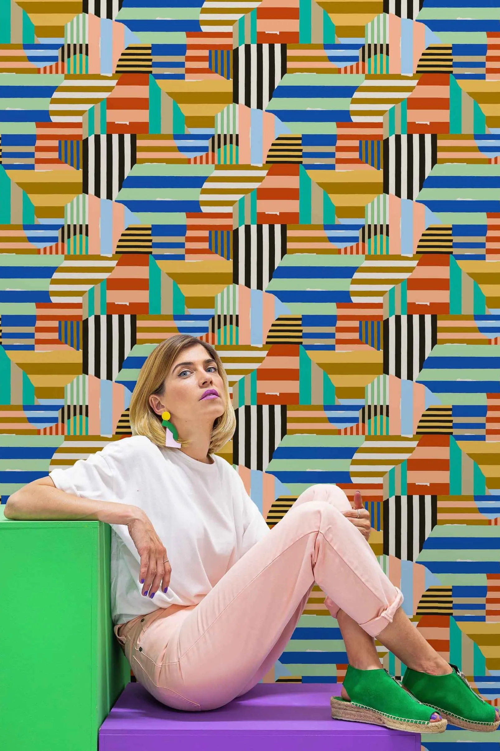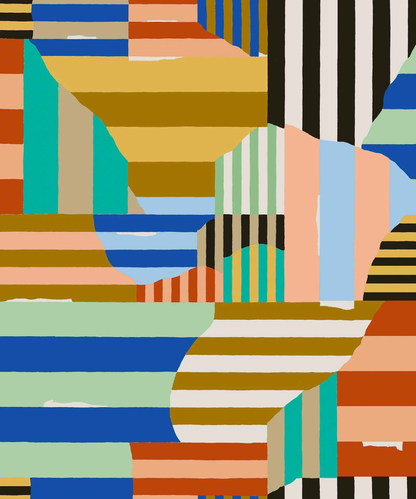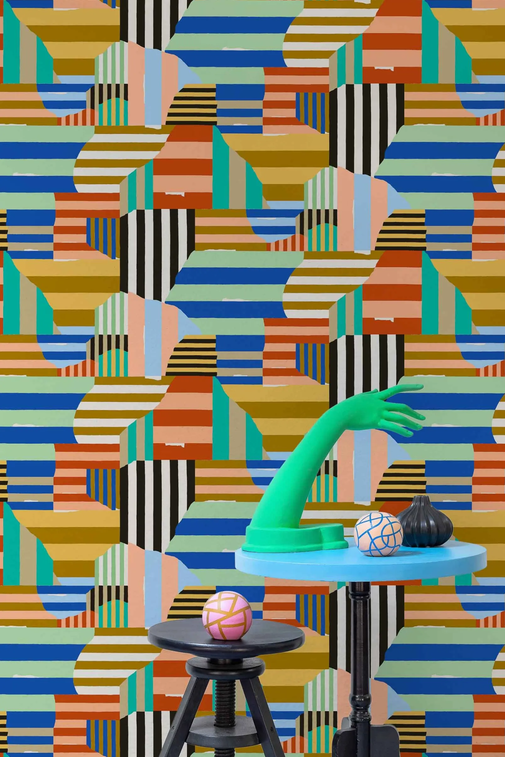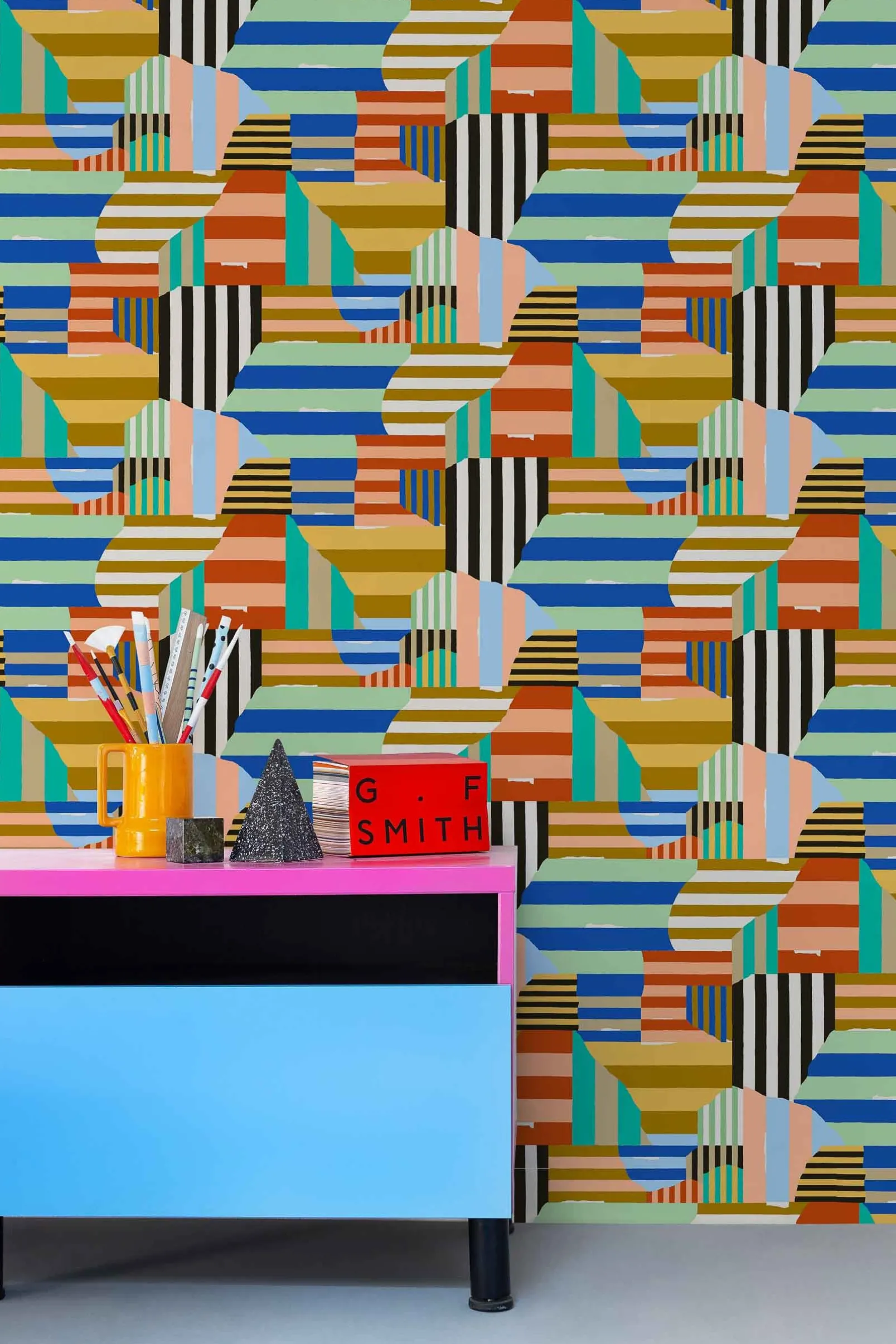 Papel pintado Landscape Night Coordonné de la colección del 40º aniversario con diseño geométrico en tonos amarillo/naranja.