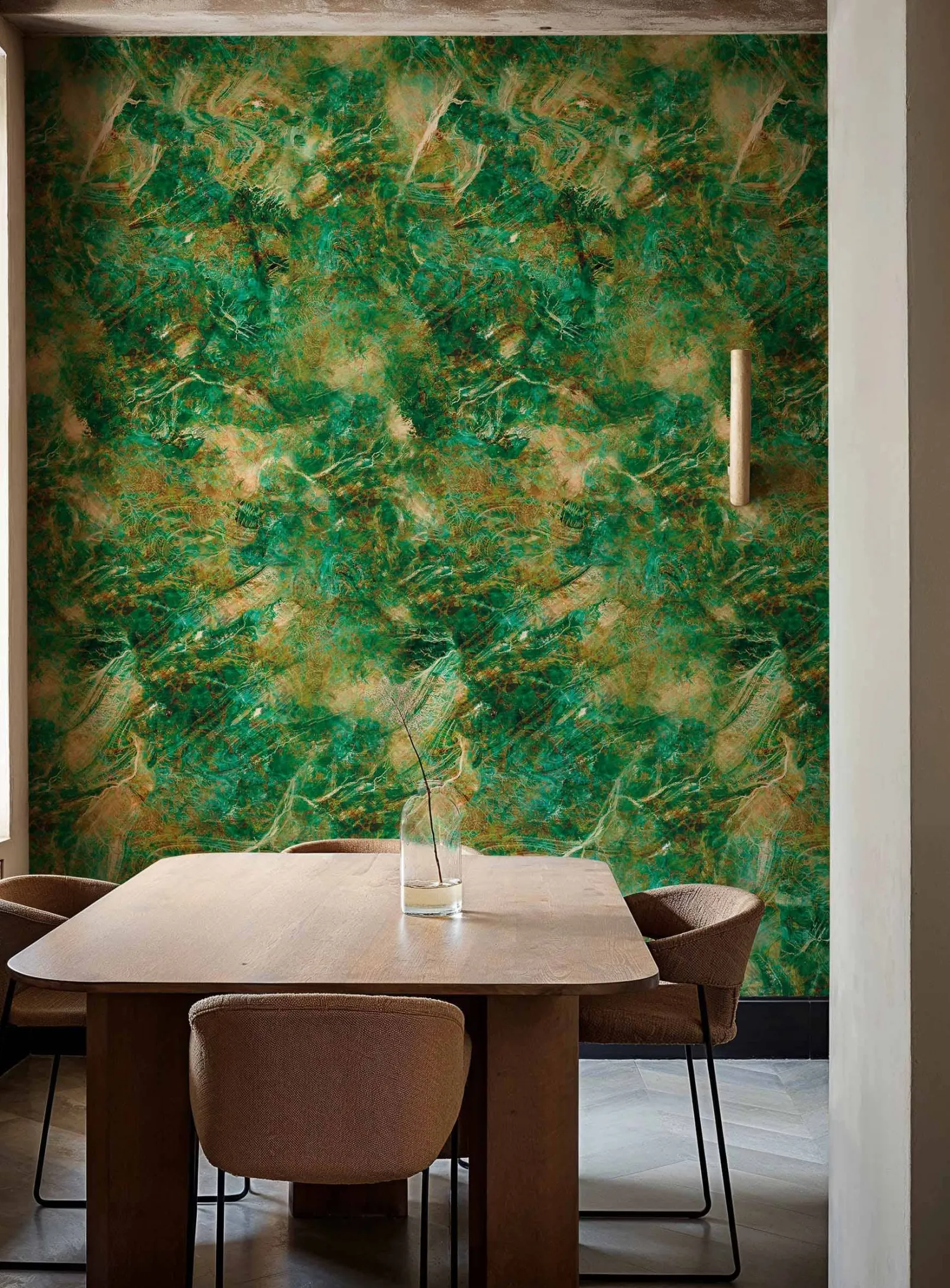 El papel pintado Lapislatzuli Green de Coordonné es una textura diseñada en tonos verdes de la colección Essentia 15/5.