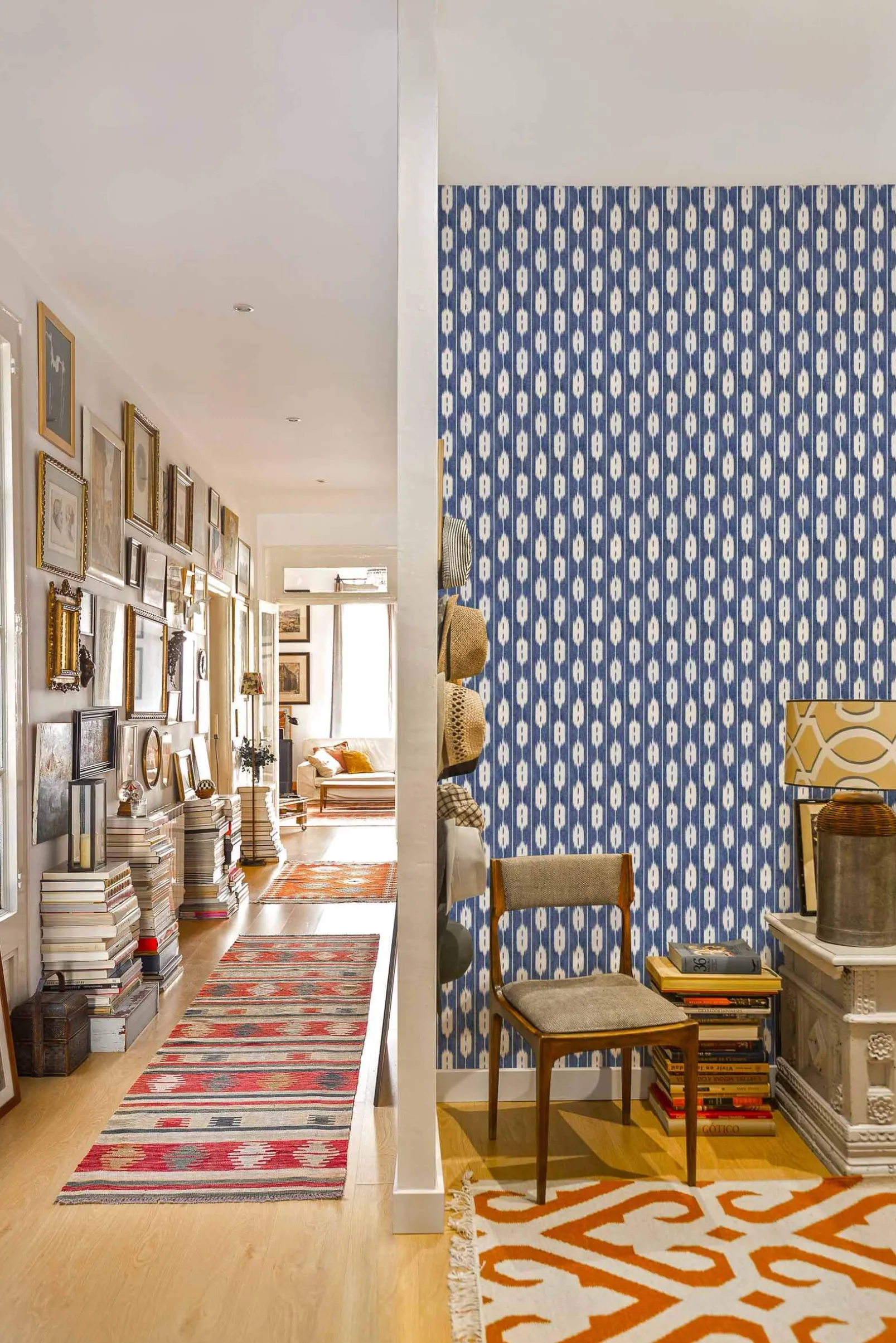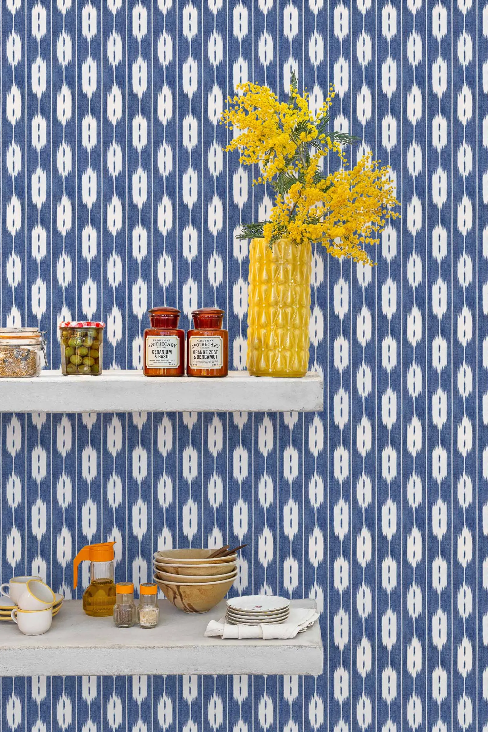 El papel pintado Llengües Blue de Coordonné es un diseño de rayas en tonos azules/marinos. Lenguas infinitas en colores mediterráneos que irradian la esencia de las Baleares.