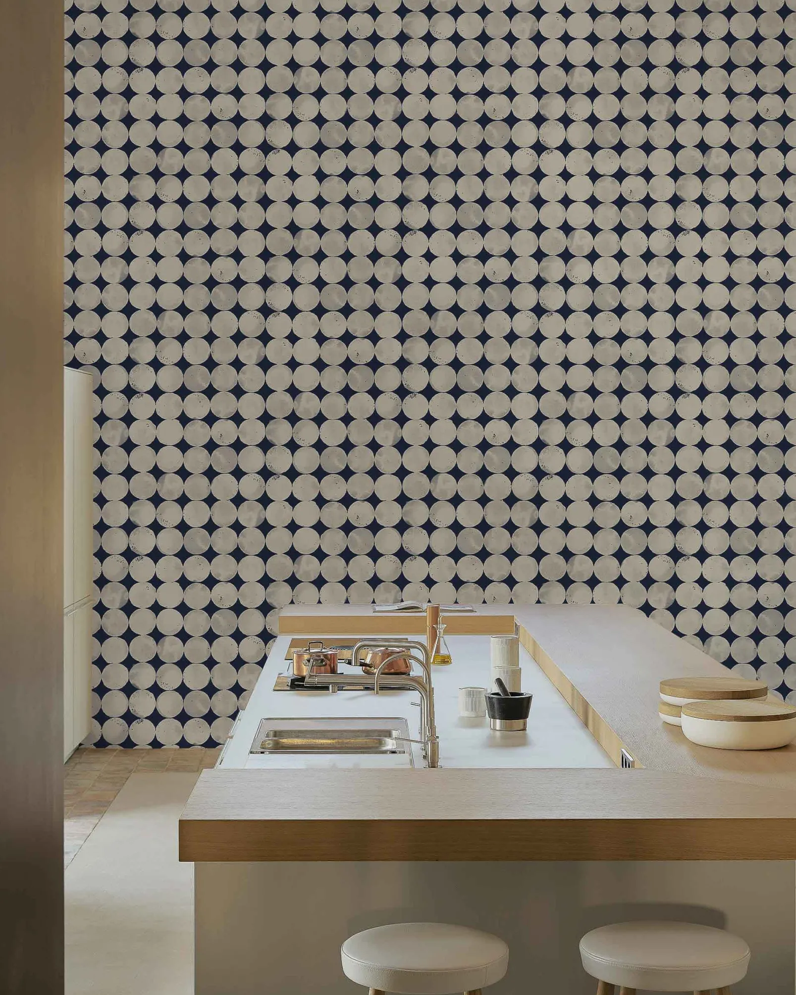 El papel pintado Luna Craters Ice de Coordonné es un diseño geométrico en color blanco/gris de la colección Geo.