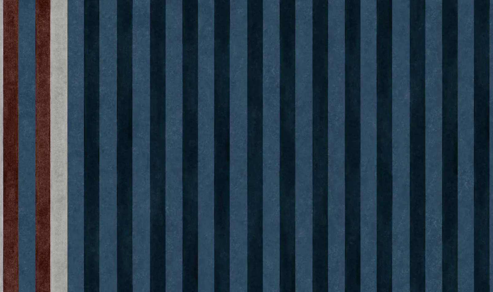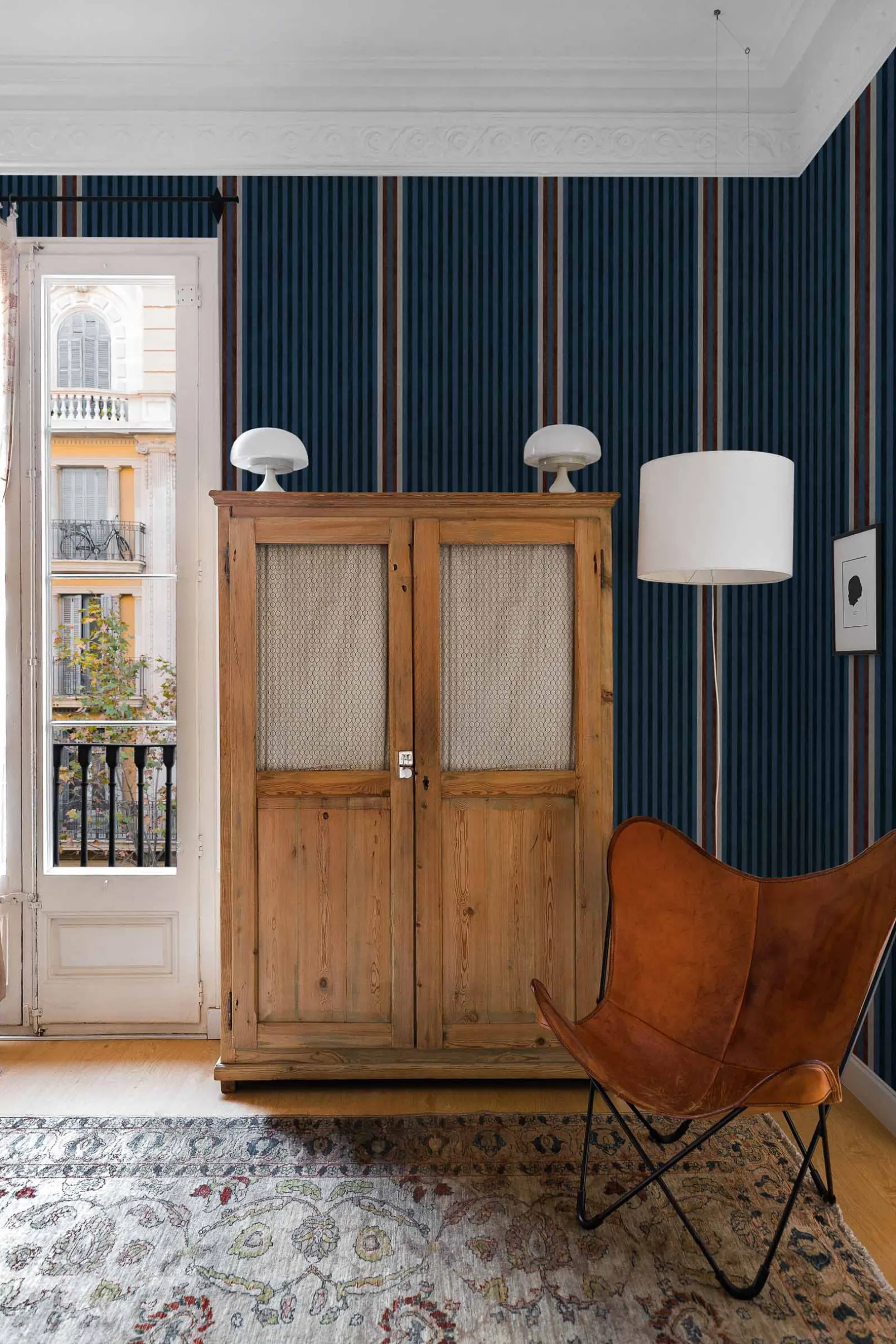 Luz y Sombra Avio de Coordonn es un papel pintado inspirado en las rayas en tonos azules/marinos. La valla de hierro se proyecta sobre el suelo con luces y sombras.