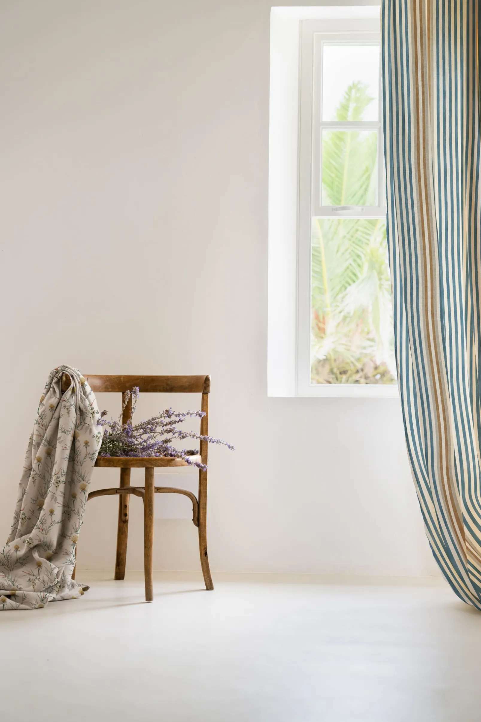 La tela Luz y Sombra Cielo de Coordonné es un diseño inspirado en rayas en blanco/azul de la colección Palacio de Cristal Fabrics.