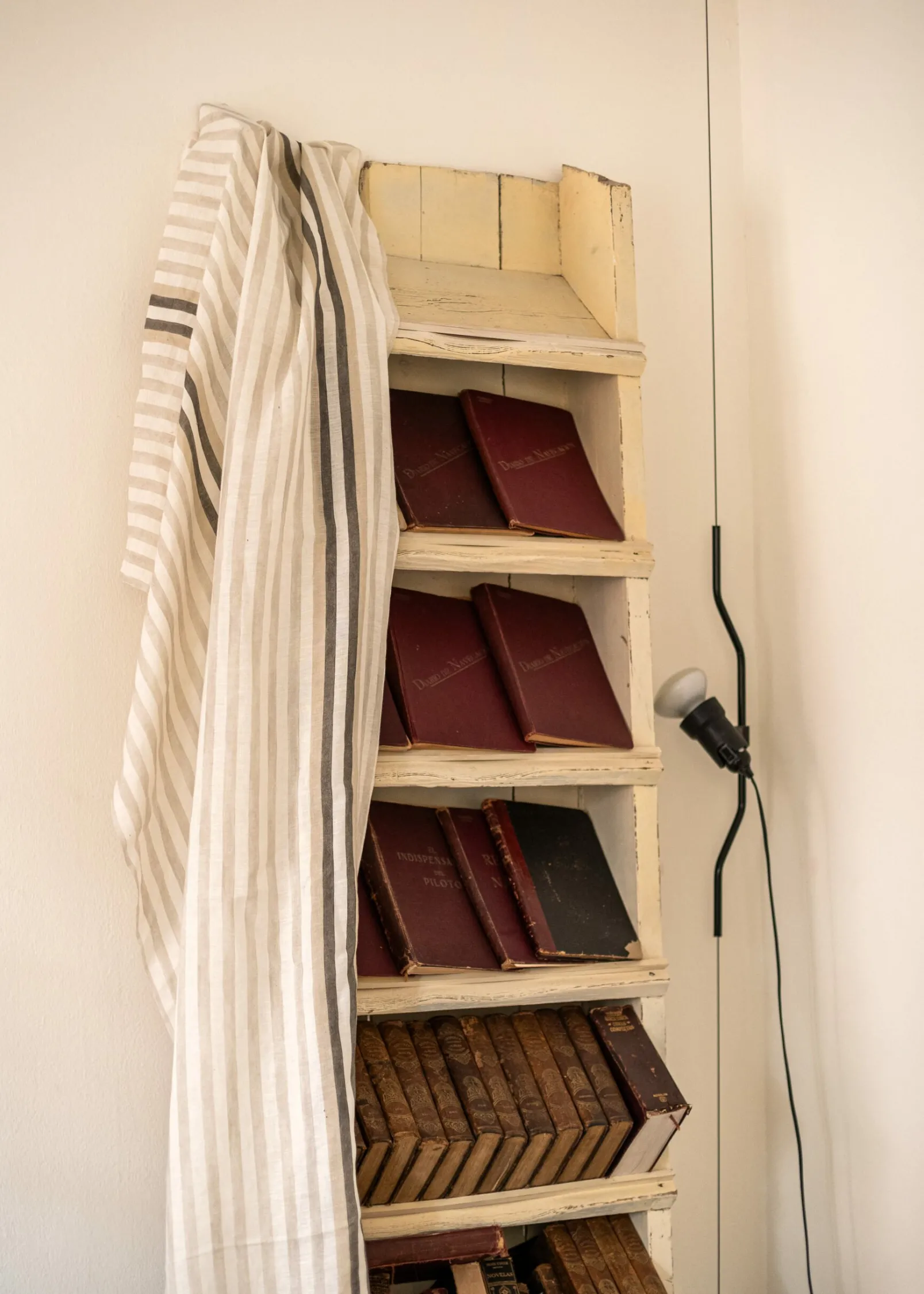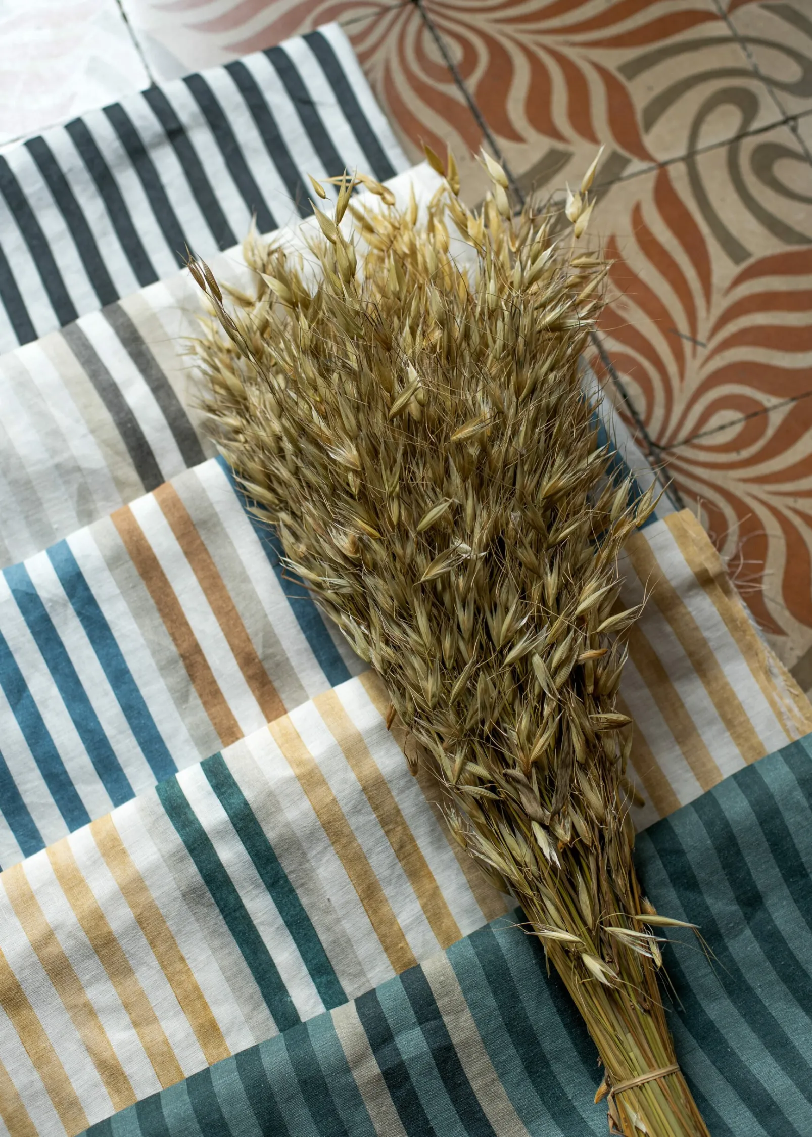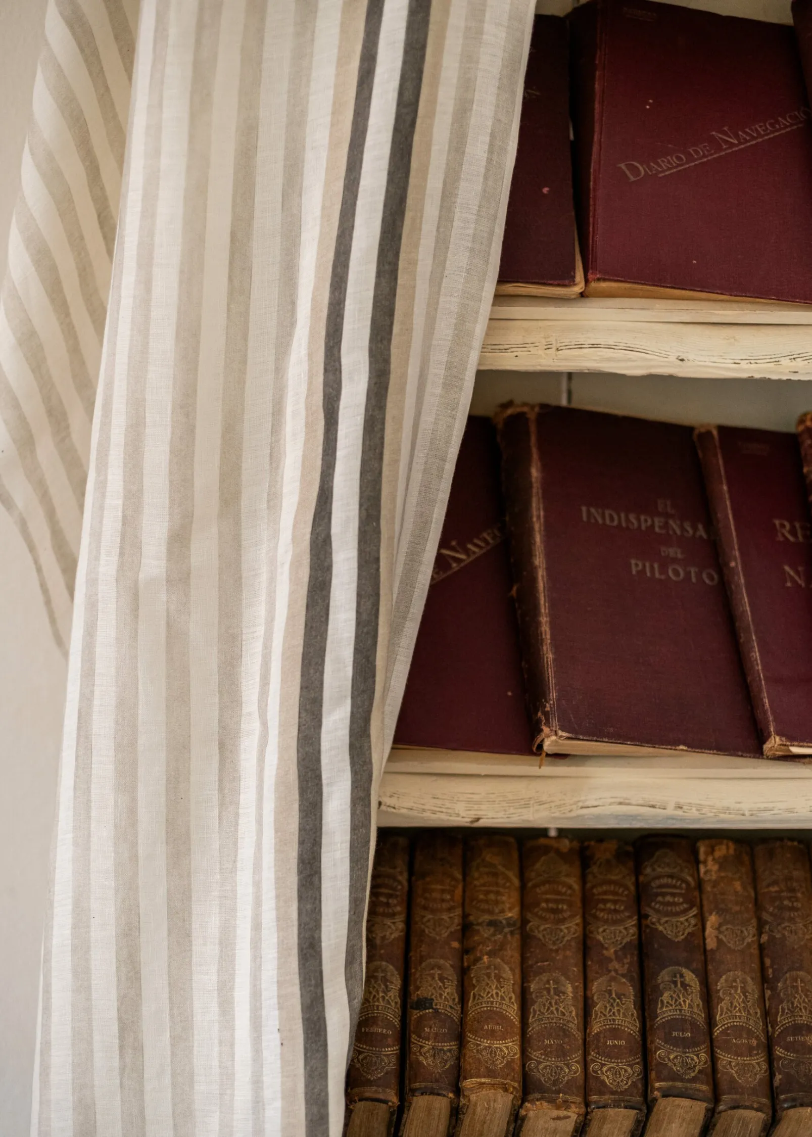 La tela Luz y Sombra Nube de Coordonné es un diseño inspirado en las rayas en blanco/gris de la colección Palacio de Cristal Fabrics.