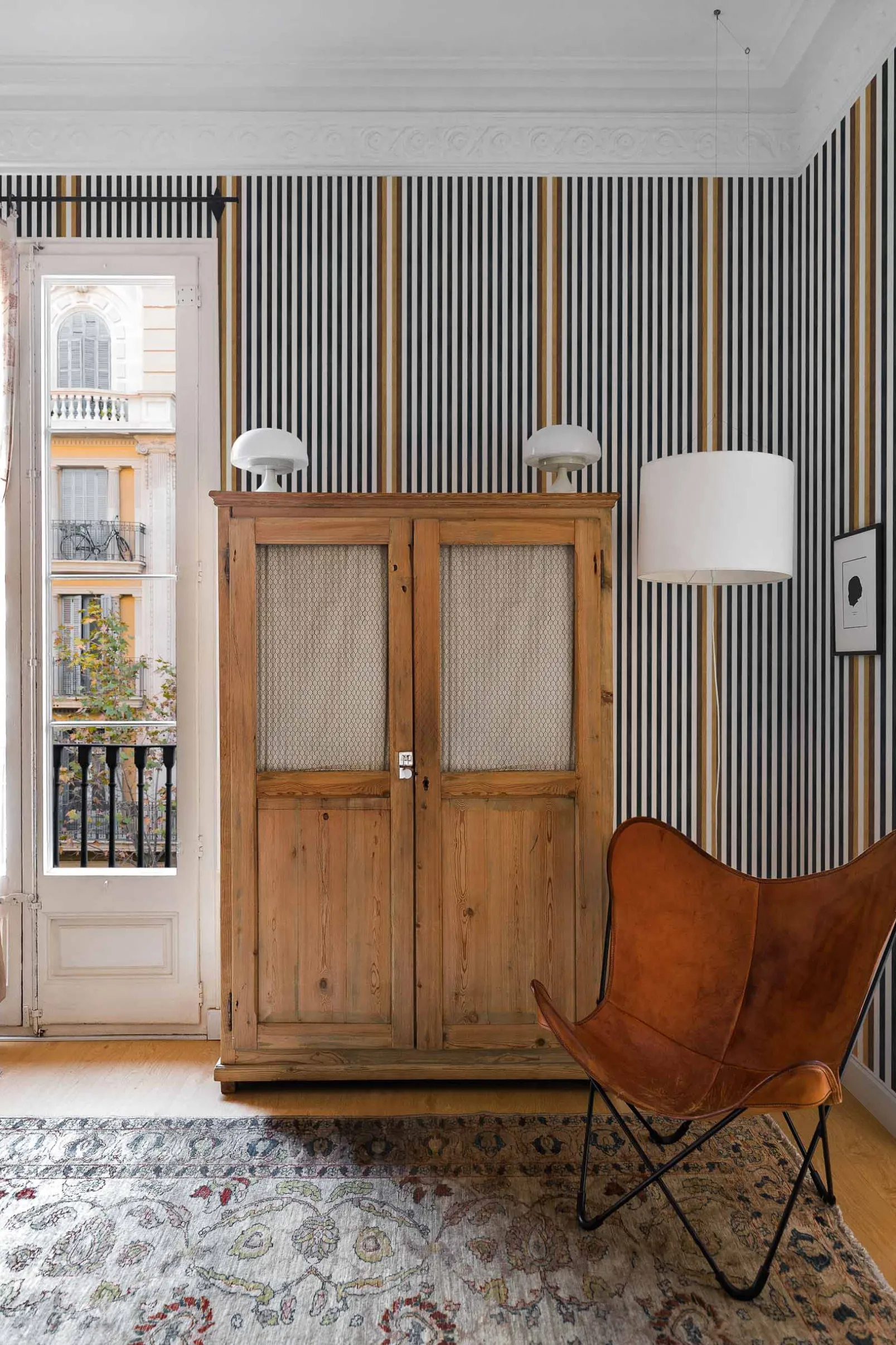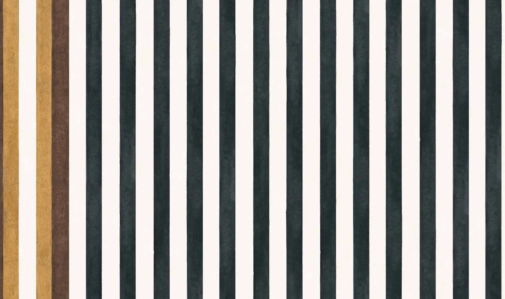 Luz y Sombra Pizarra de Coordonn es un papel pintado inspirado en las rayas en tonos negros. La valla de hierro se proyecta sobre el suelo con luces y sombras.