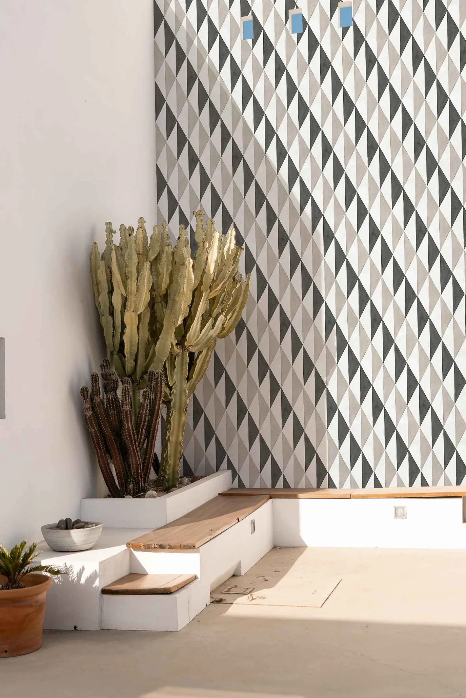 El papel pintado Maa Plata de Coordonné es un diseño geométrico en tonos blanco/gris de la colección Maasai.