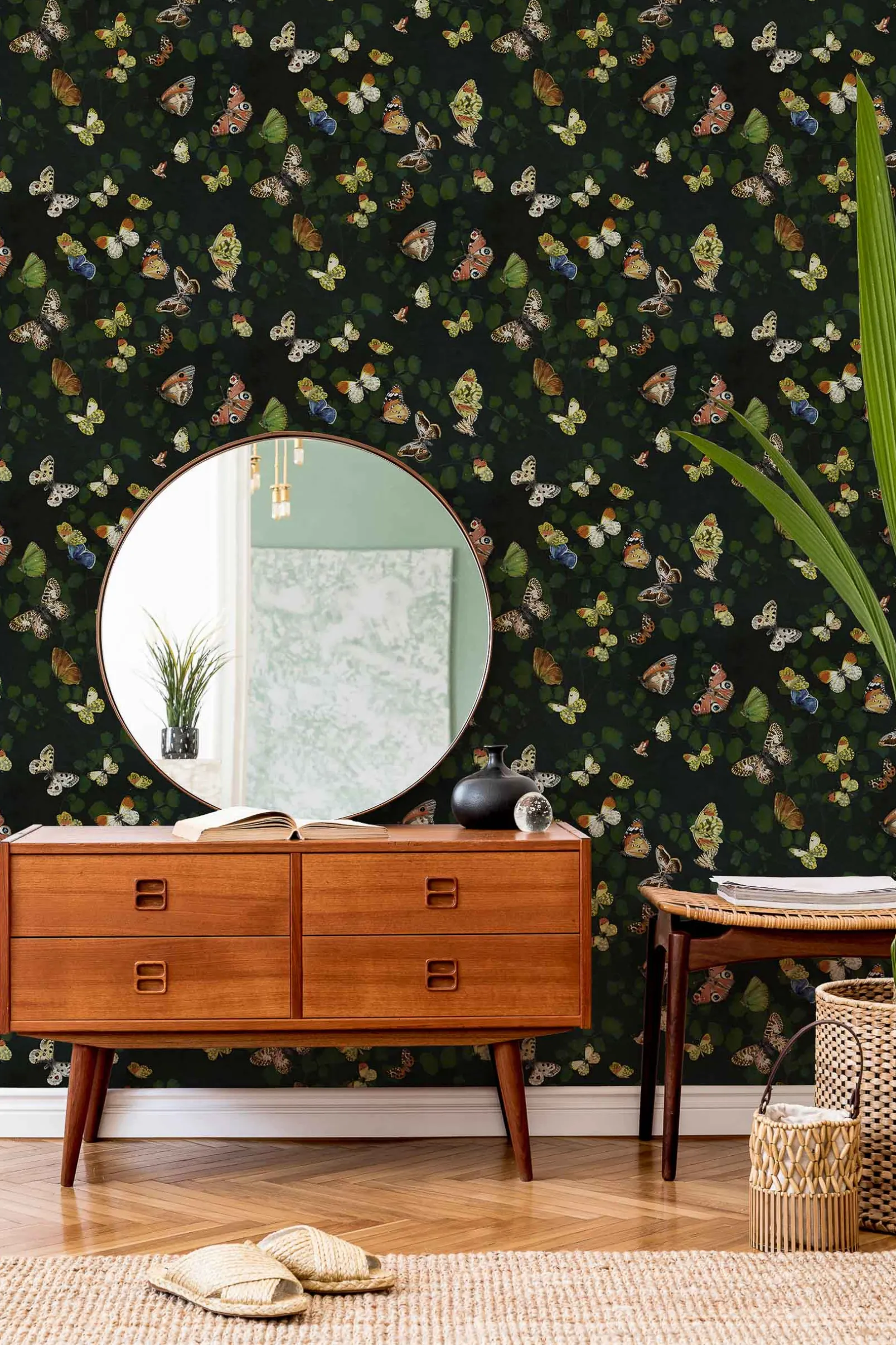 Papel pintado Noche de mariposas mágicas de Coordonné en un animal diseñado en tonos negros de la colección Naturae.