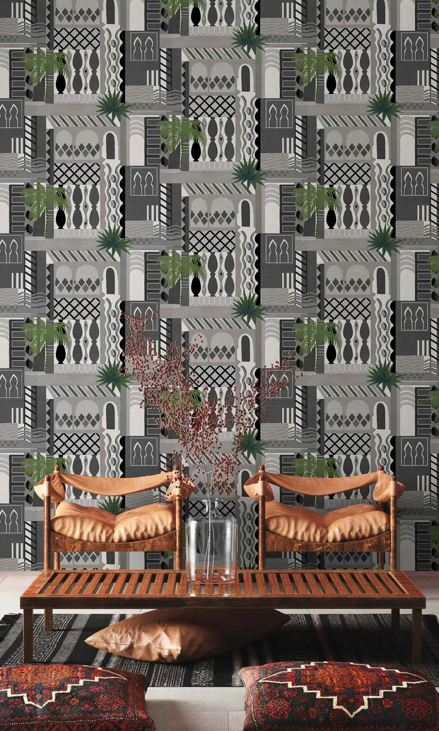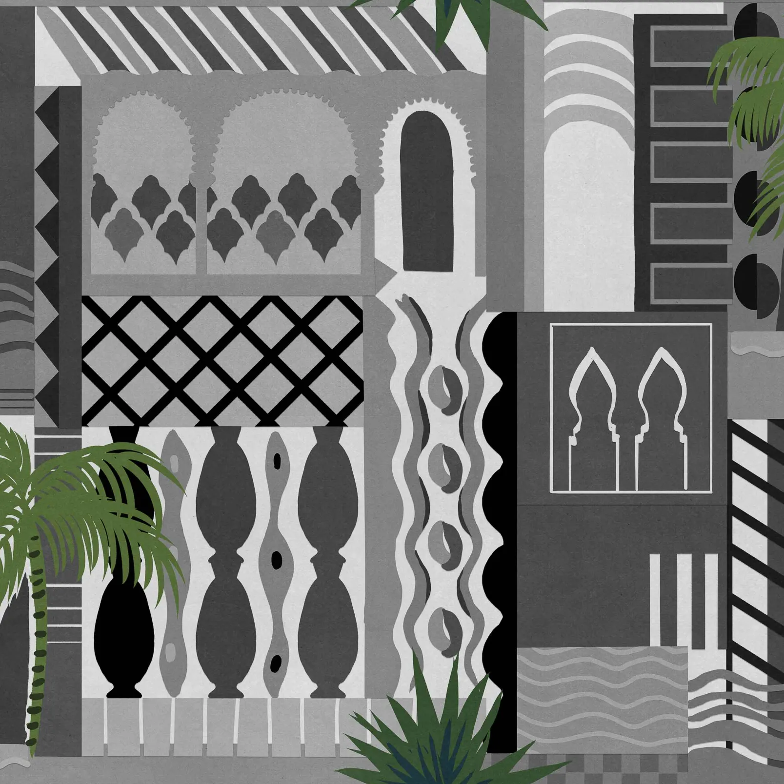 El papel pintado Majorelle Off de Coordonné es un diseño arquitectónico en tonos blanco/gris de la colección Wander.