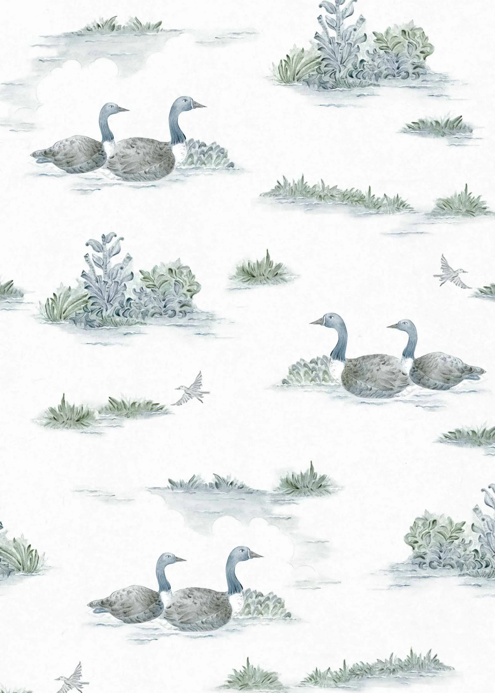 El pato azulón Aqua de Coordonné es un diseño animal en azul/azul marino de la colección Cotswolds. El plumaje suave y definido de las aves que planean entre juncos y nenúfares.