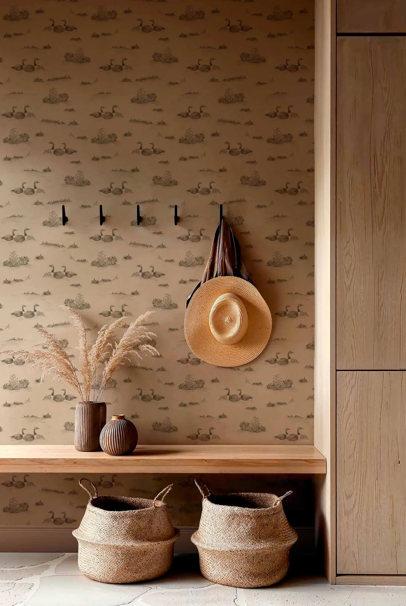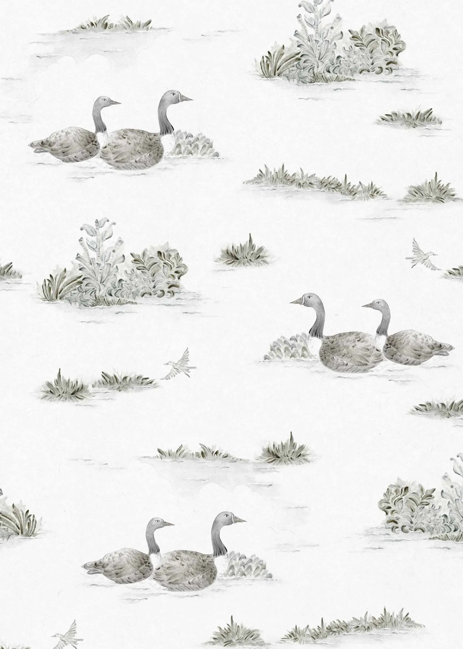 El pato azulón de Coordonné Silver es un diseño de Animales en blanco/gris de la colección Cotswolds. El plumaje suave y definido de las aves que planean entre juncos y nenúfares.