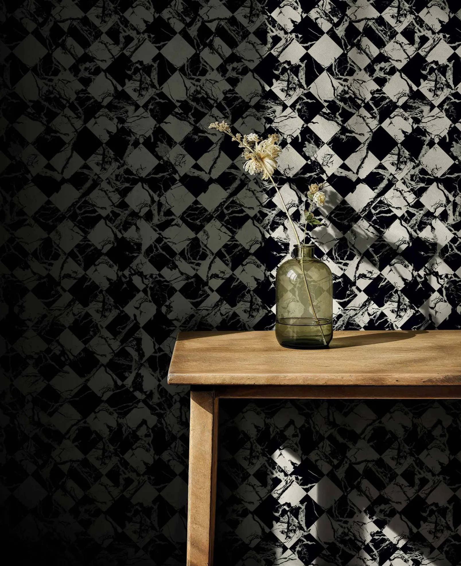 El papel pintado Marble Geometric de Coordonné es una textura diseñada en tonos negros de la colección Essentia 15/5.