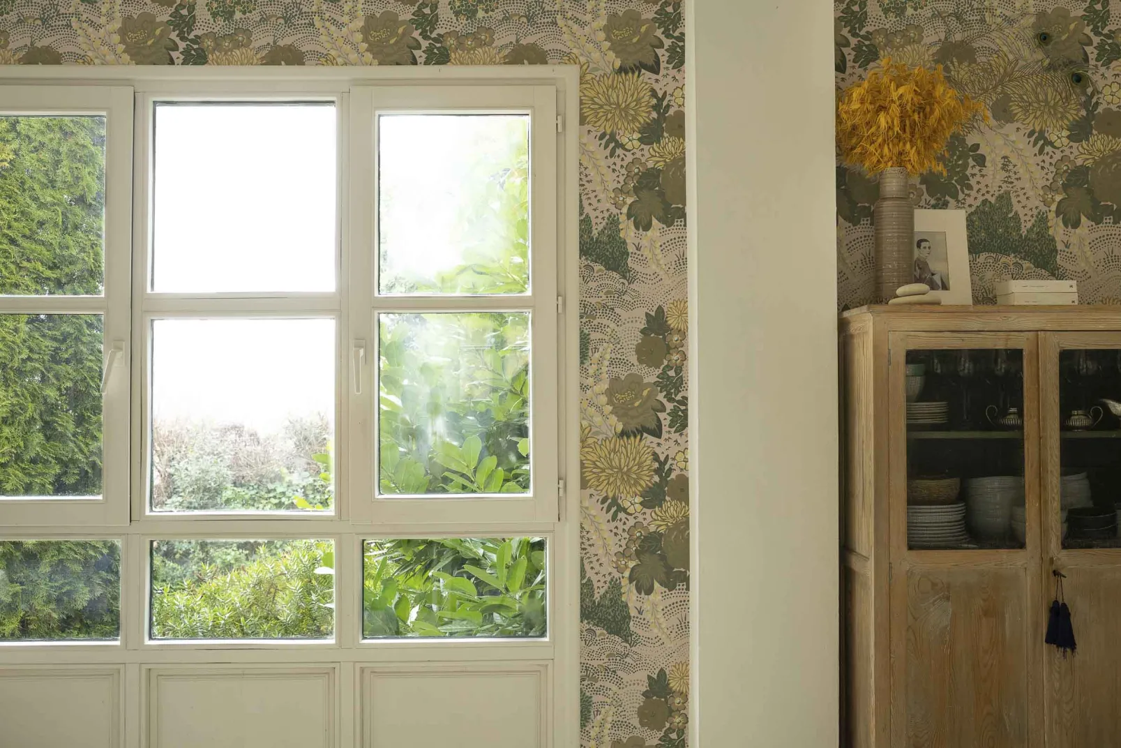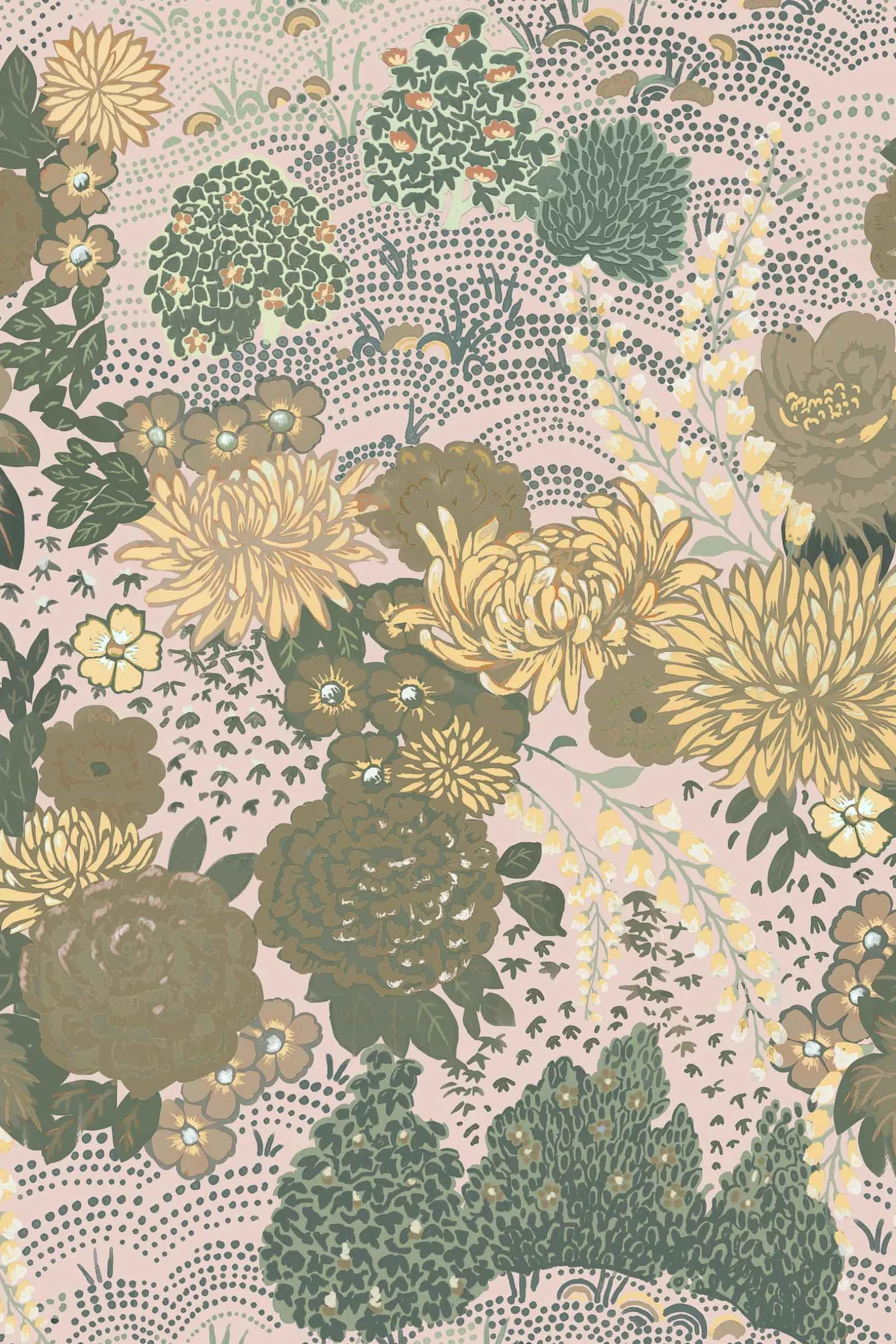 Maria Luisa Rosáceo de Coordonné es un diseño floral en rosa/lila de la colección Feria. Colinas ostentosamente cubiertas con abundancia de crisantemos.