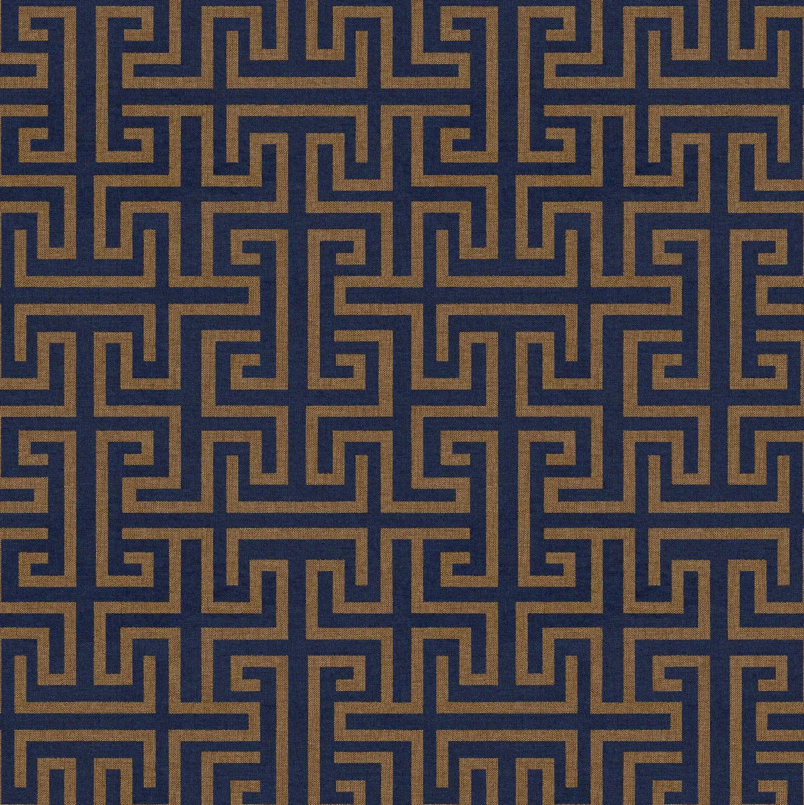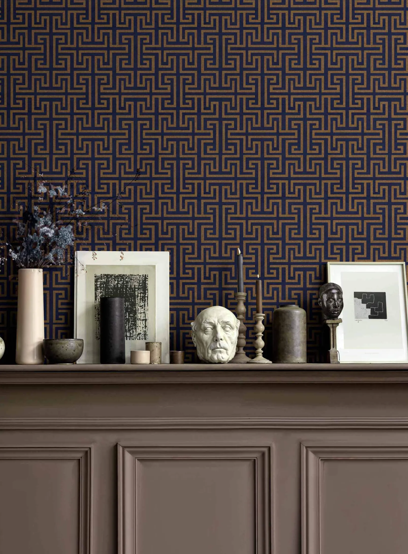 Maze Ultramarine de Coordonne es un papel pintado de inspiración geométrica en tonos Azul/Azul Marino de la colección Lattice Geometrics. El reto de los caminos imposibles.