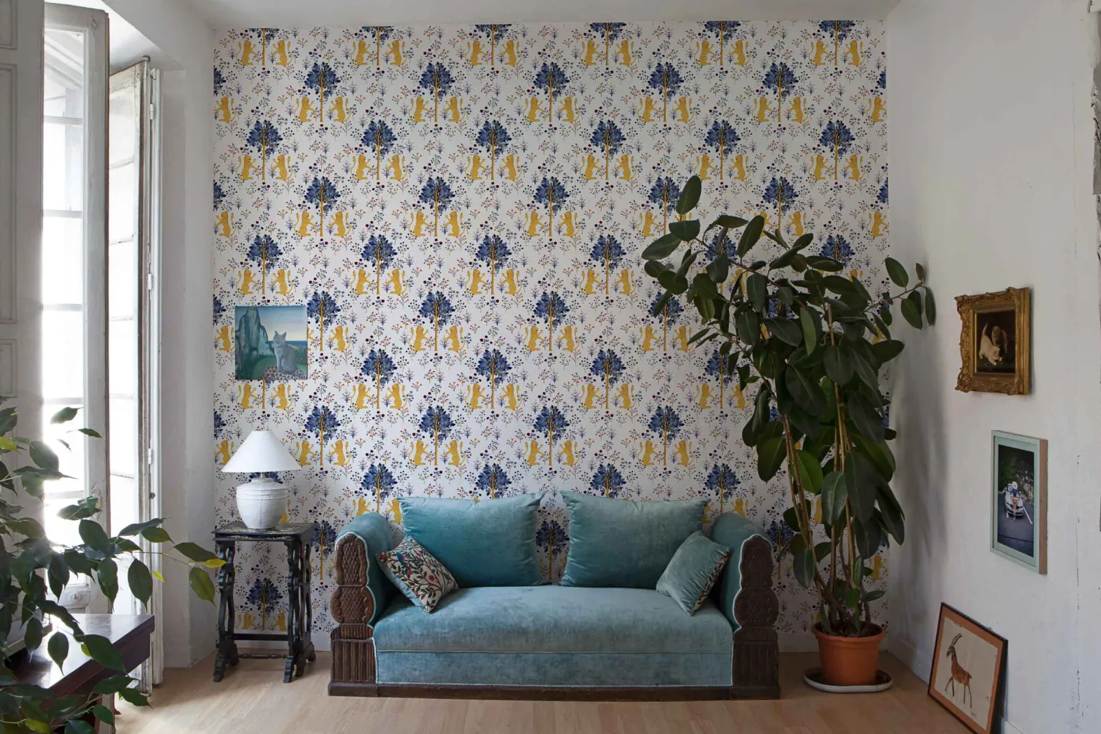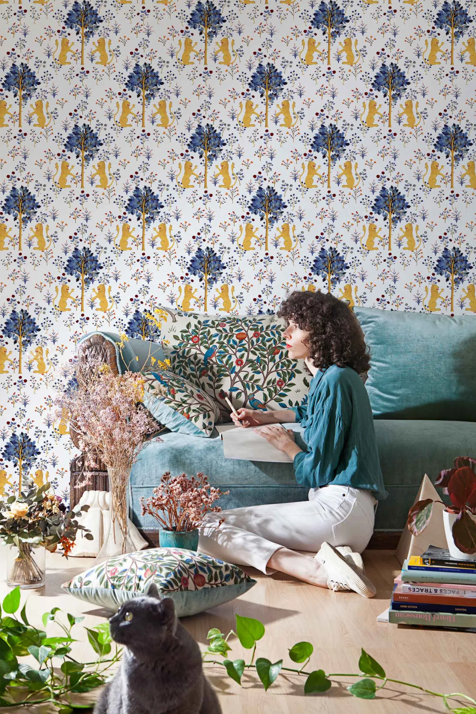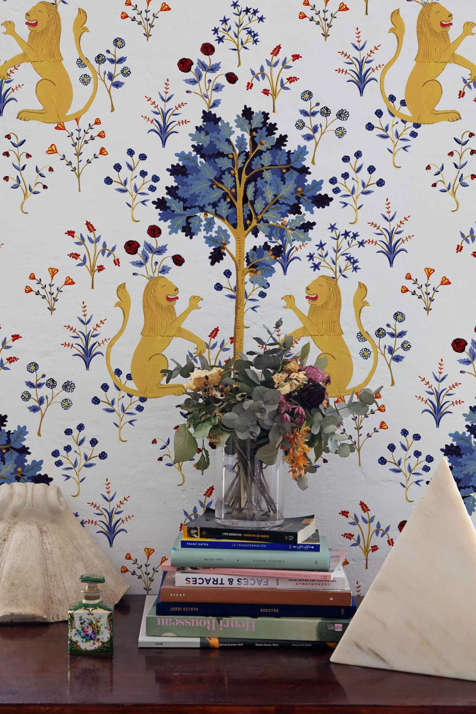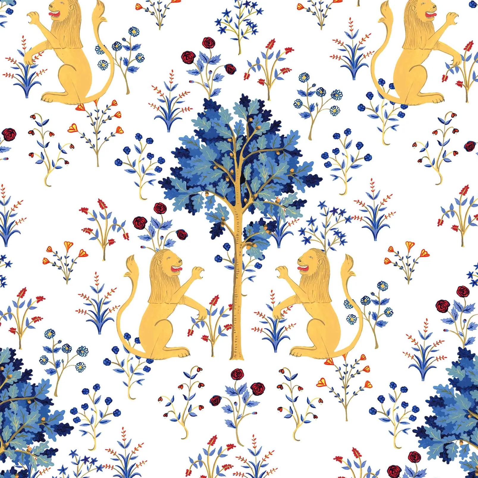 Papel Pintado Medieval Tapestry Pure White de la colección 40 aniversario con diseño de animales en tonos blancos/grises.