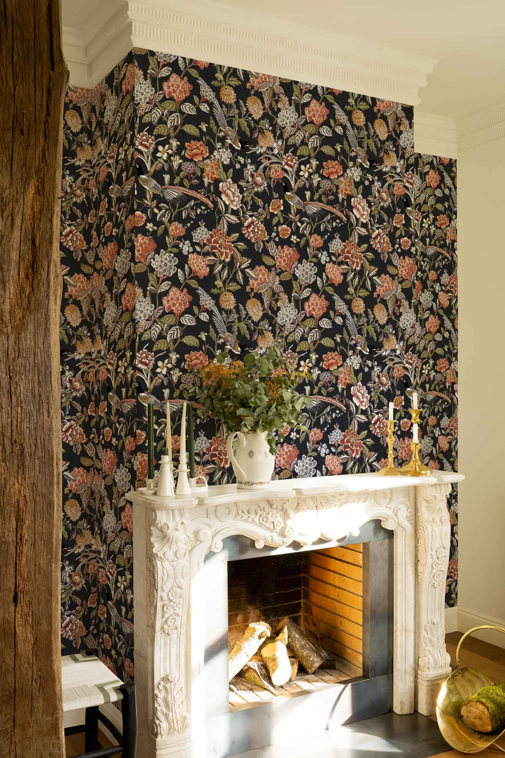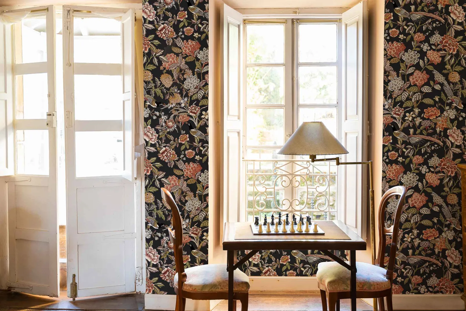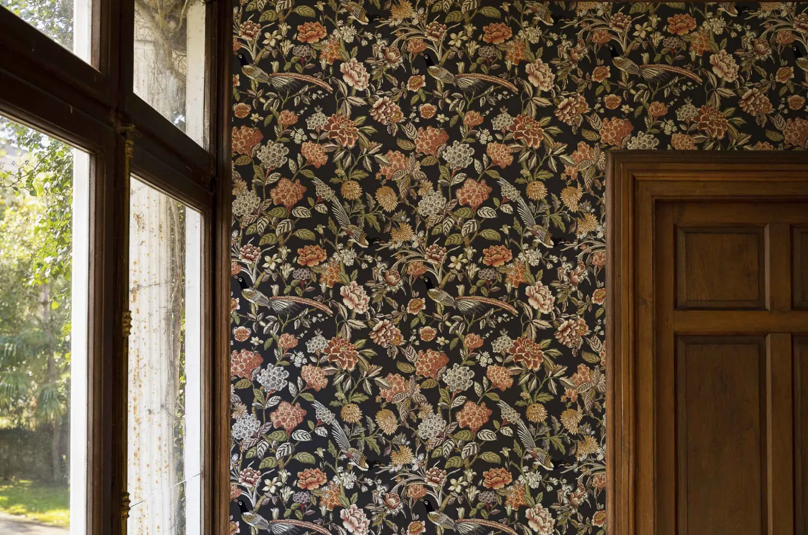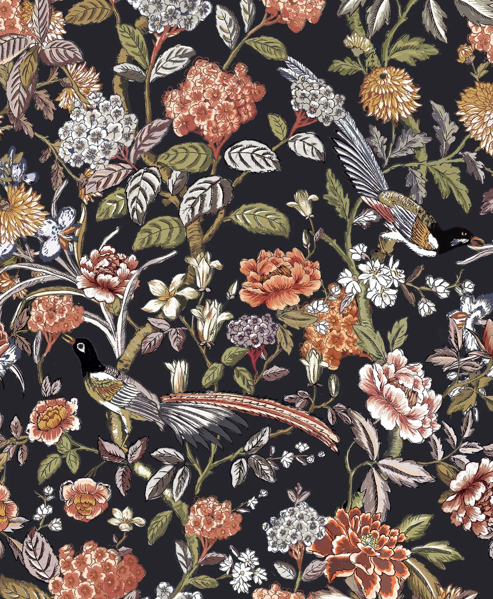 Mercedes Azabache de Coordonné es un diseño floral en negro de la colección Feria. Ingeniosa composición de faisanes entre peonías.