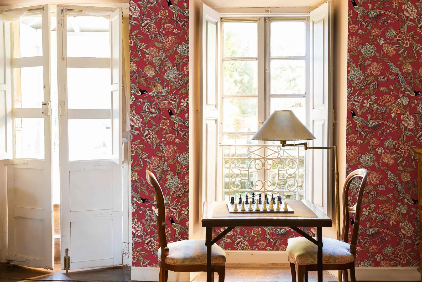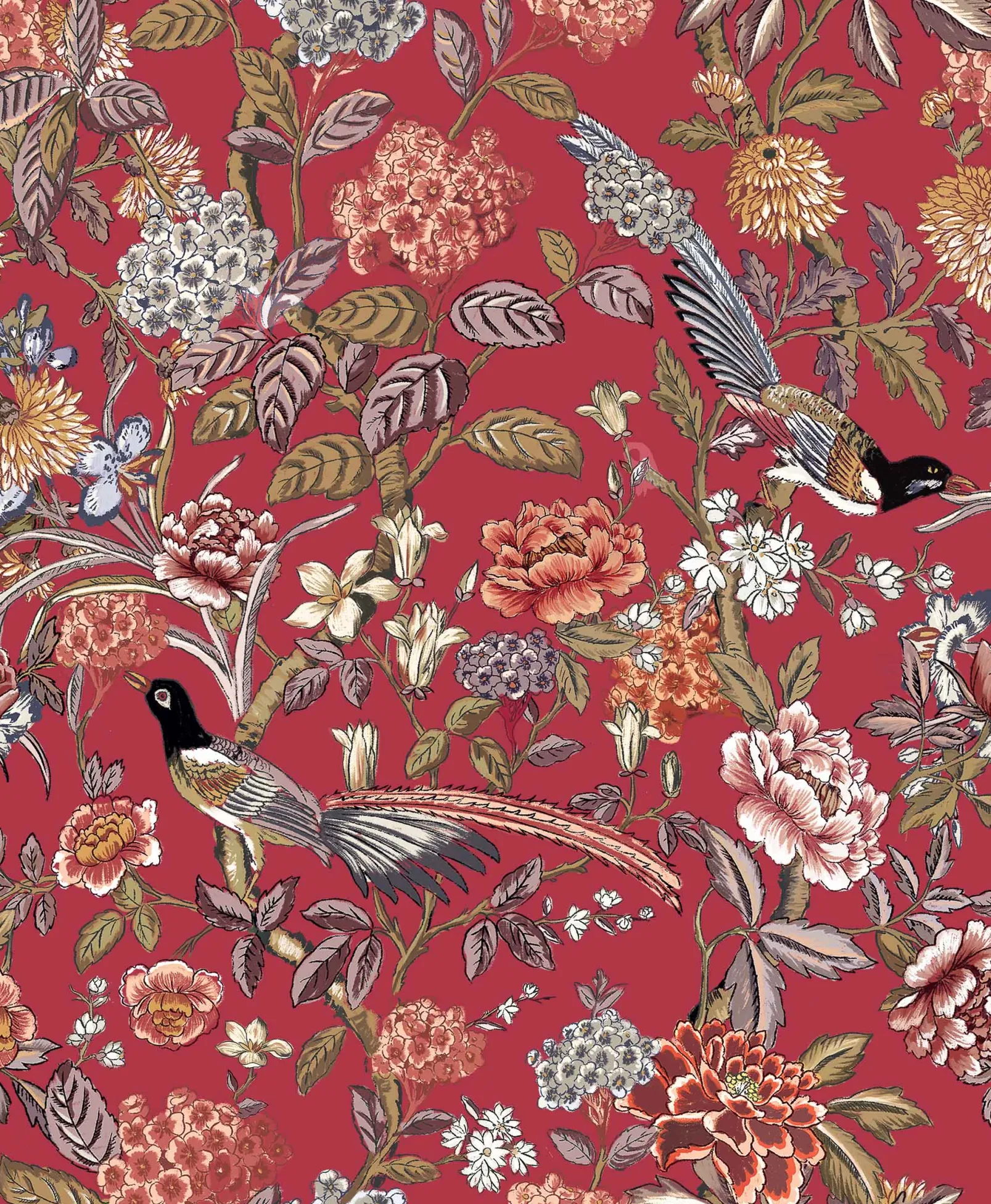 Mercedes Carmesí de Coordonné es un diseño floral en Rojo/Vino de la colección Feria. Ingeniosa composición de faisanes entre peonías.