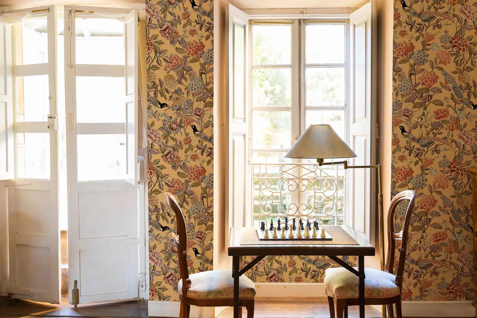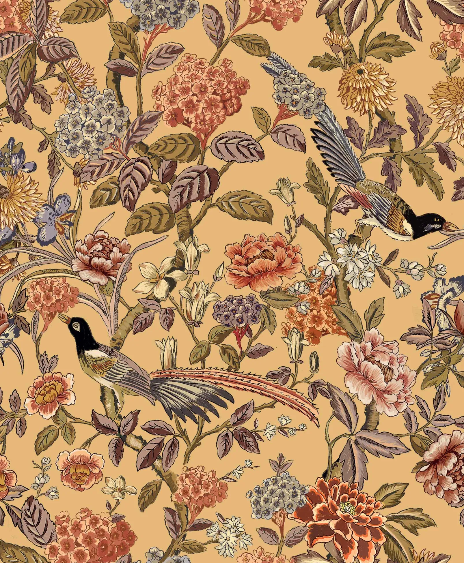 Mercedes Mostaza de Coordonné es un diseño floral en amarillo/naranja de la colección Feria. Ingeniosa composición de faisanes entre peonías.