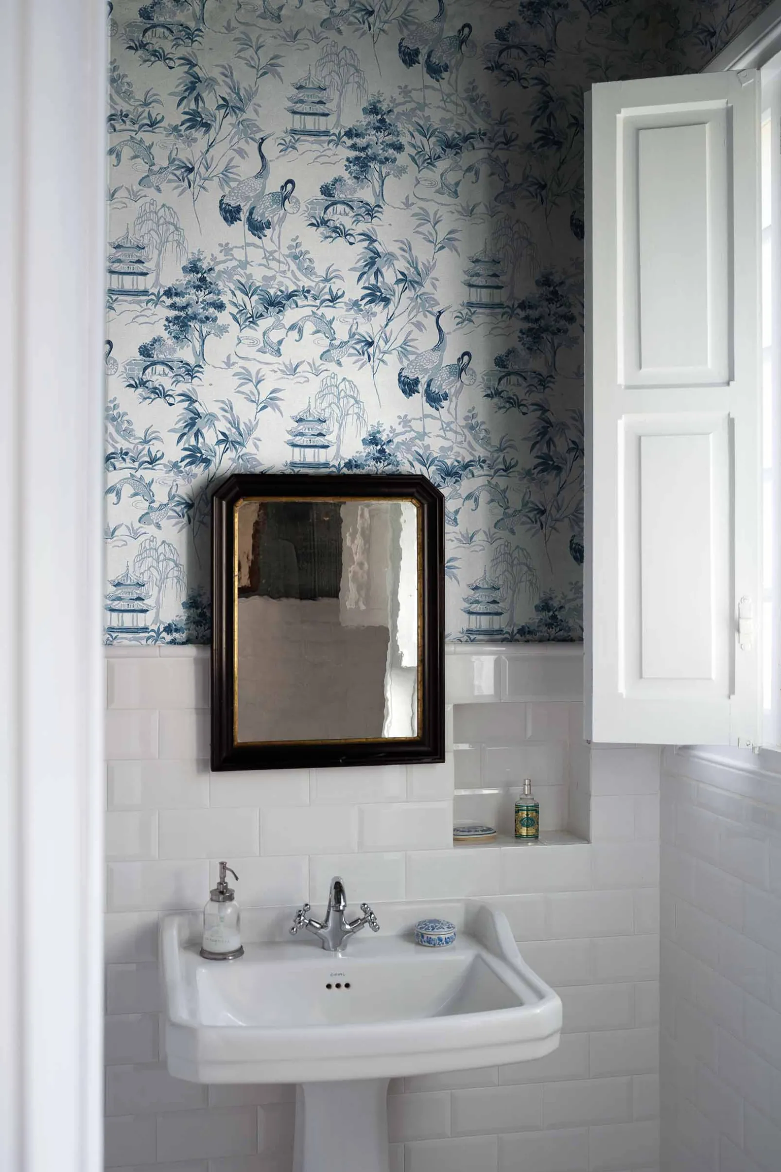El Ming Pagoda Zafiro es un papel pintado de inspiración animal en color blanco con tonos azules.