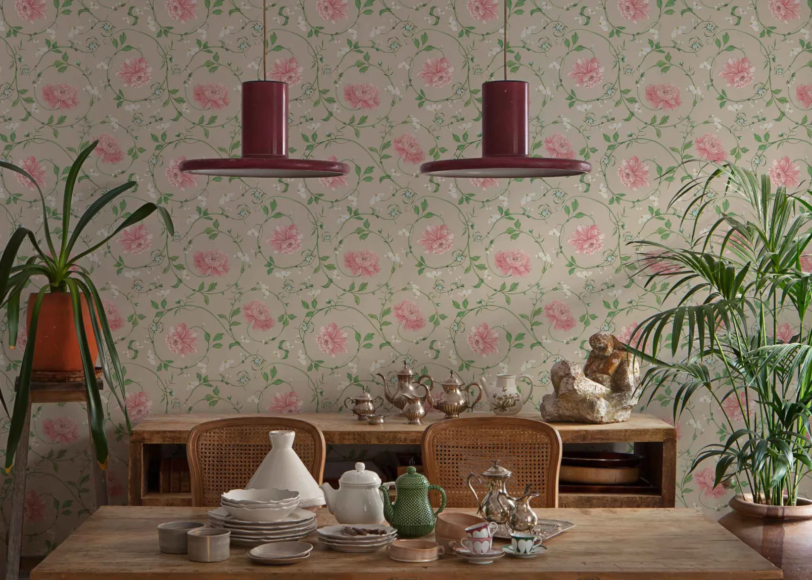 Papel pintado Mirabelle Stella Coordonné de la colección 40 aniversario con diseño floral en tonos beige/nude .