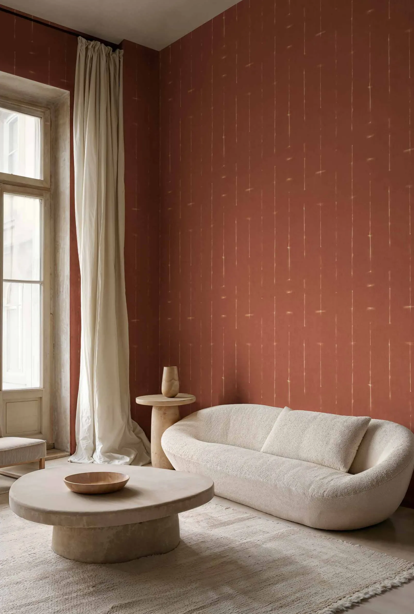 Miura Amber de Coordonné es un diseño de rayas en amarillo/naranja de la colección Shibori. La sutil fluidez de los susurros del viento.