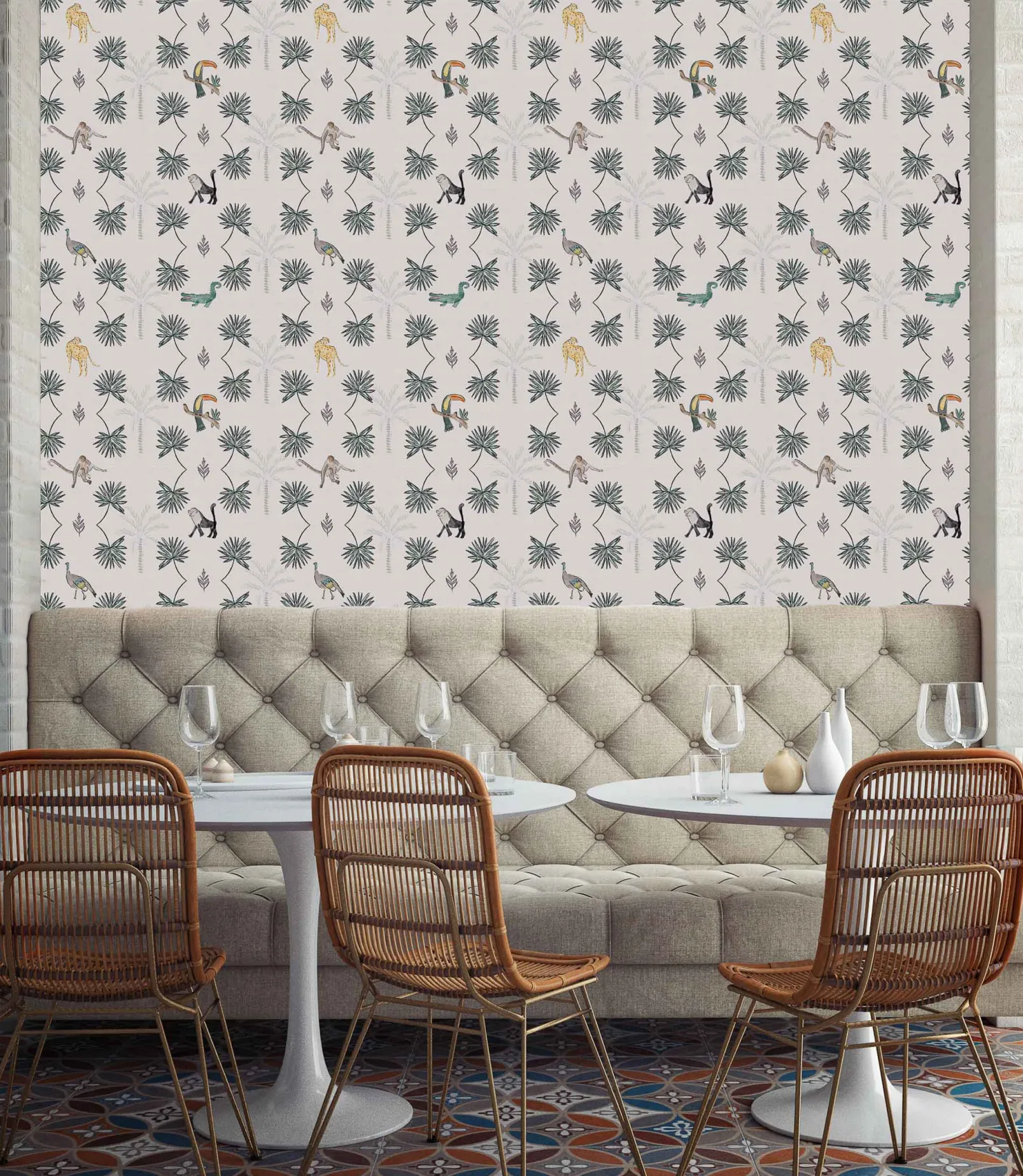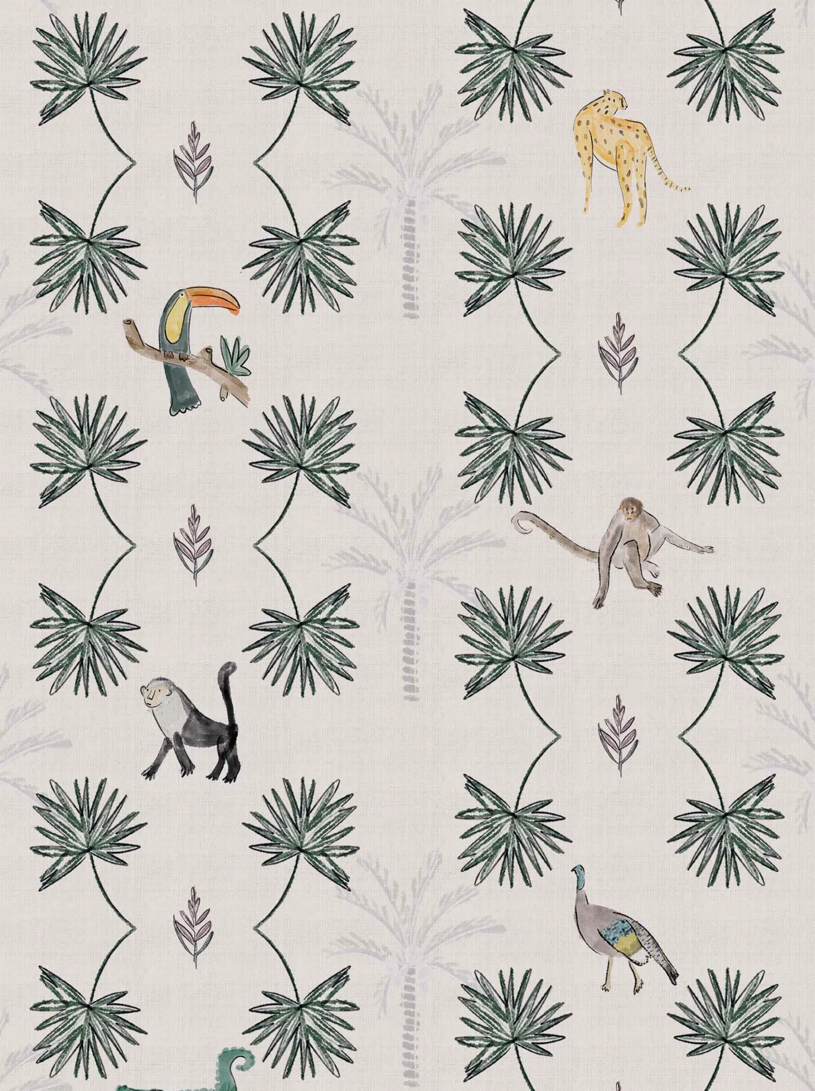 El papel pintado Monteverde Off de Coordonné es un diseño vegetal en tonos blanco/gris de la colección Wander.