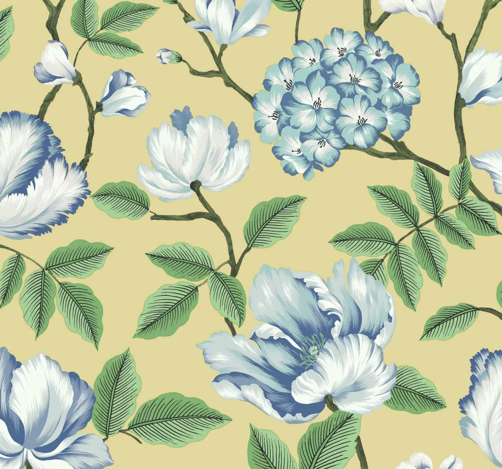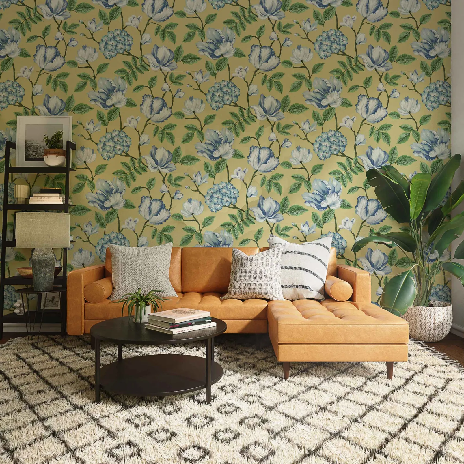 El papel pintado Morning Garden Vanilla de Coordonné es un diseño floral en tonos amarillo/naranja de la colección Enchanted.