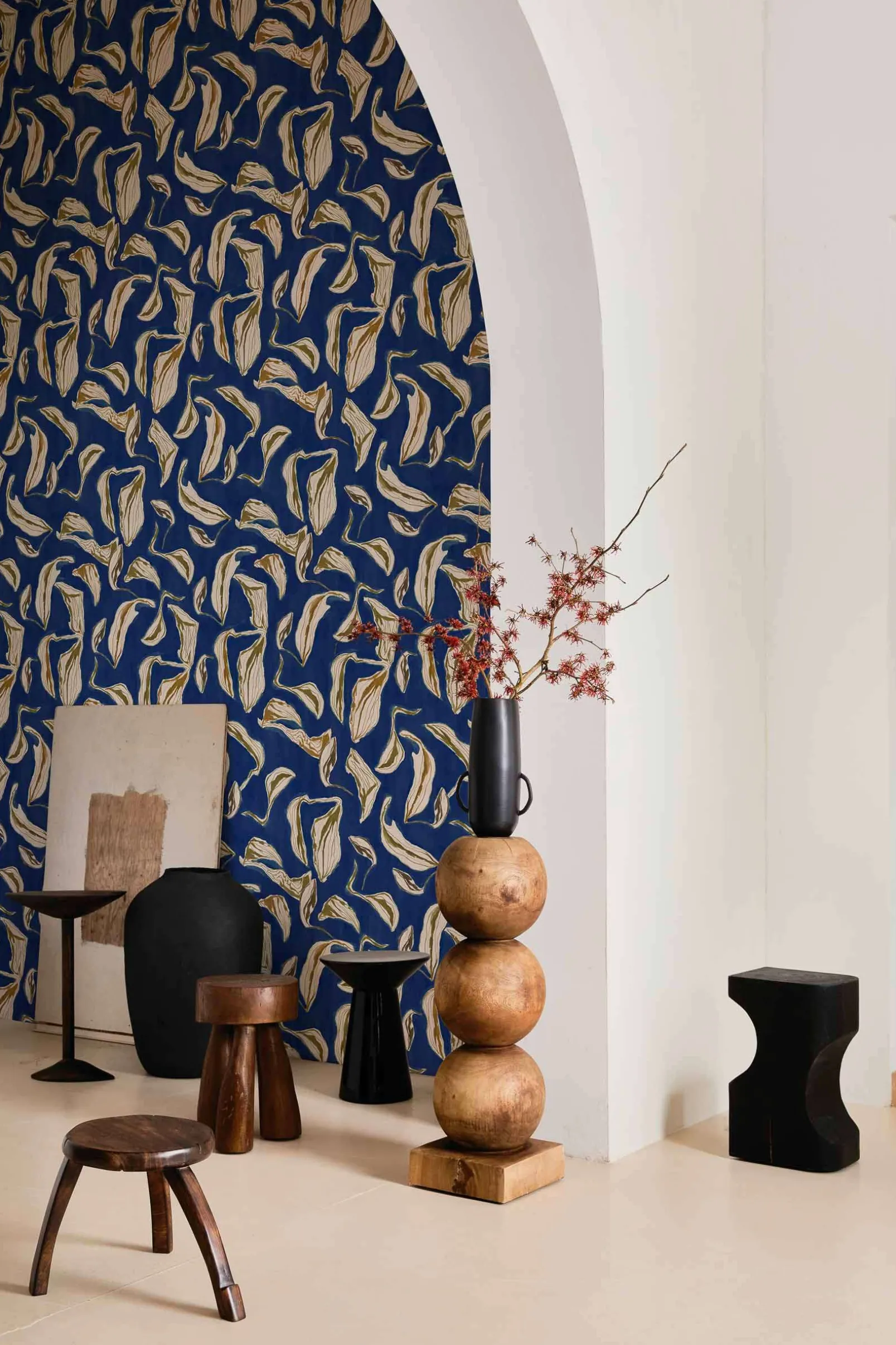 El papel pintado Moroccan branches Blue de Coordonné es un diseño vegetal en tonos azules/azules marinos de la colección Central Saint Martins – Rest Time. Ese viaje por Marruecos donde los colores, la luz y la vegetación mediterránea cautivaron mi alma.