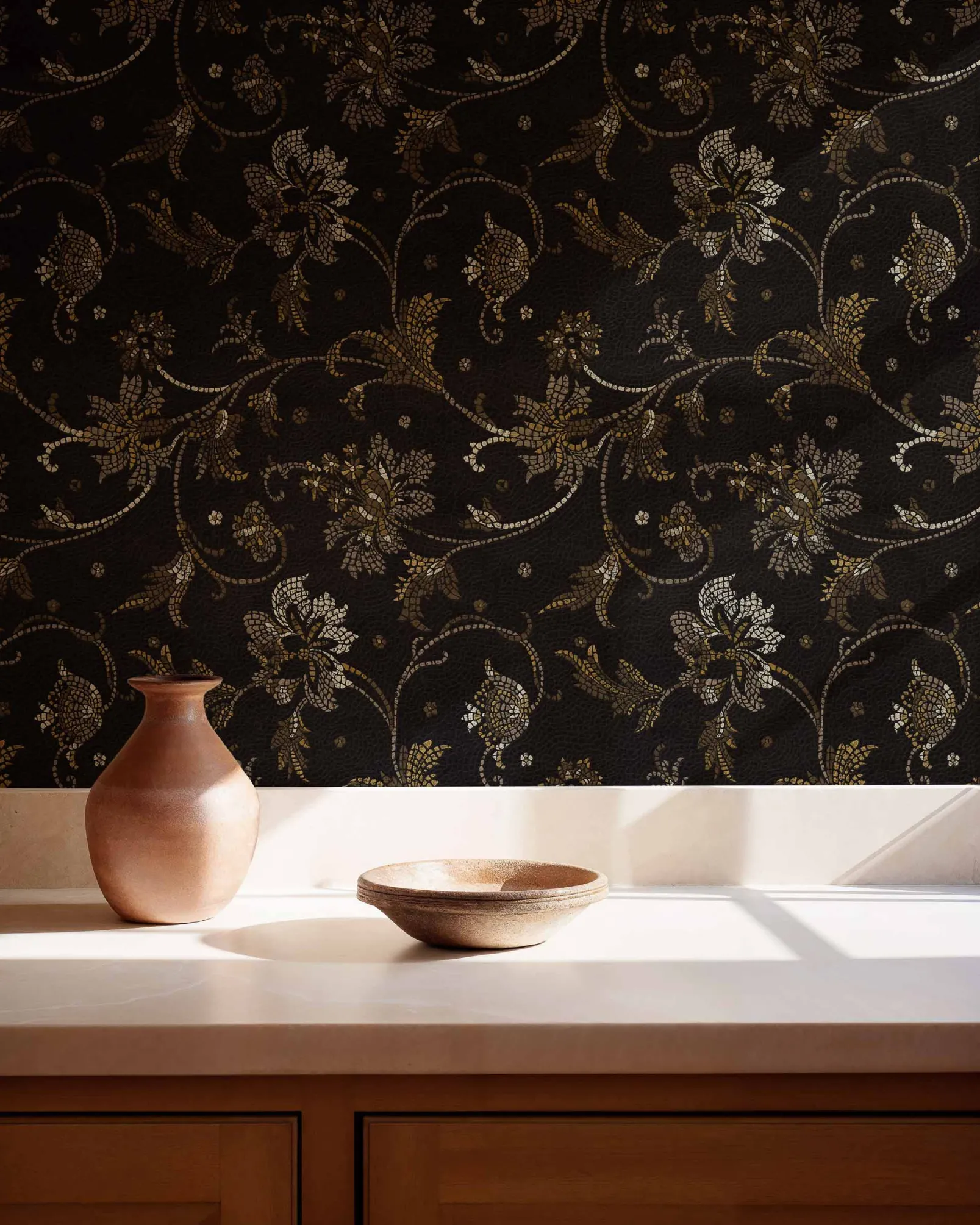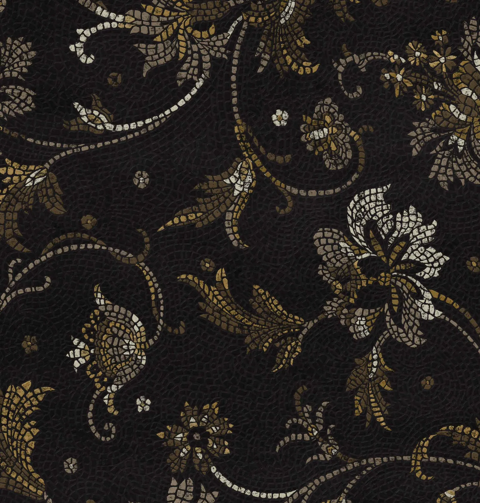 El Mosaicum Coal de Coordonné es un diseño vegetal en negro de la colección Pompeya. El arte de los mantos de teselas de mármol y vidrio que adornaban los suelos palaciegos.