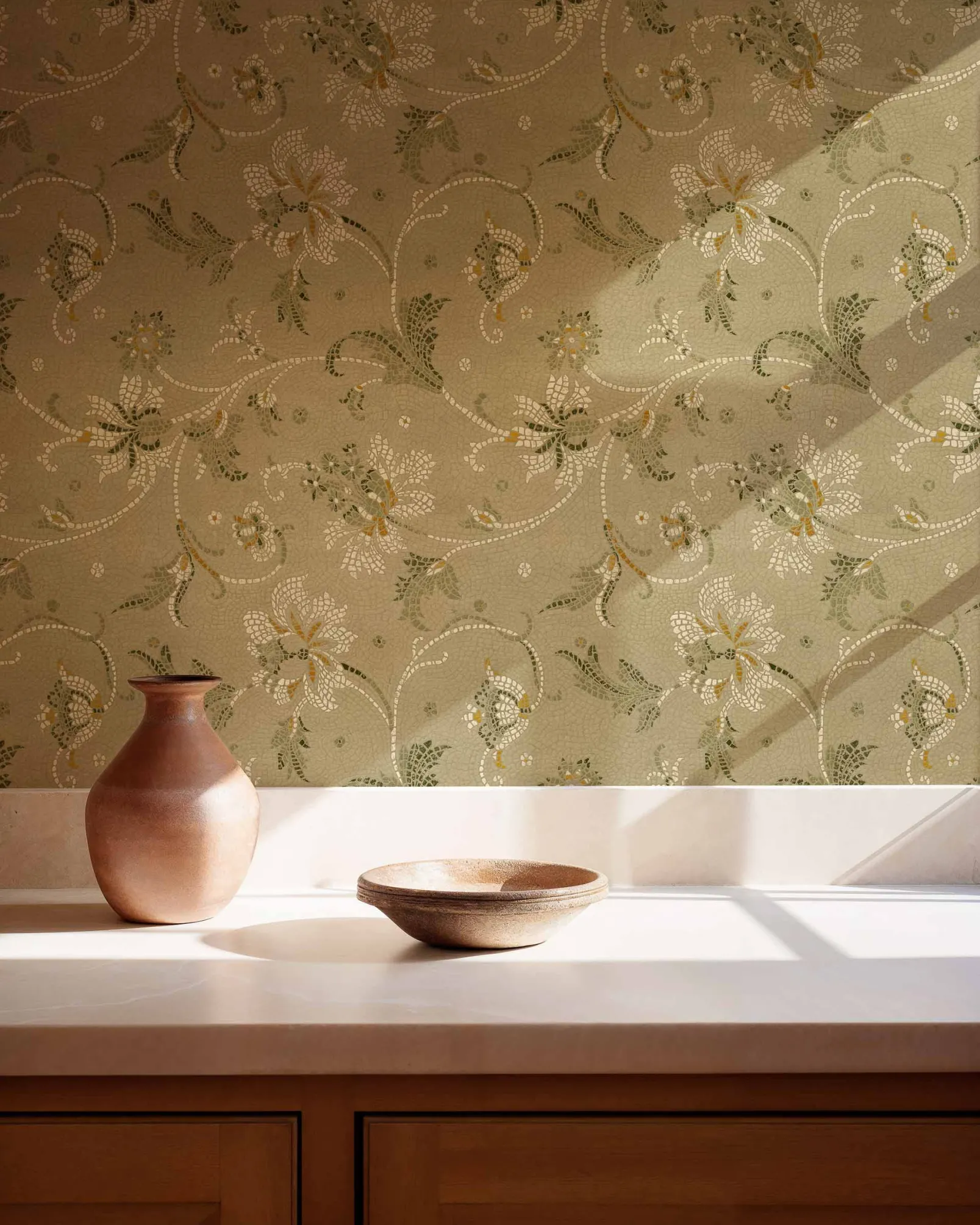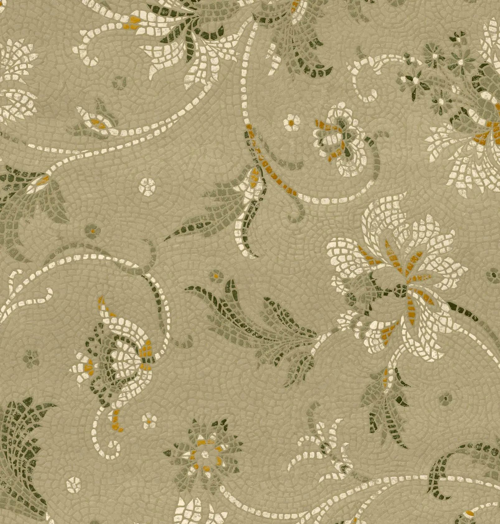 El Mosaicum Matcha de Coordonné es un diseño vegetal en verde de la colección Pompeya. El arte de los mantos de teselas de mármol y vidrio que adornaban los suelos palaciegos.