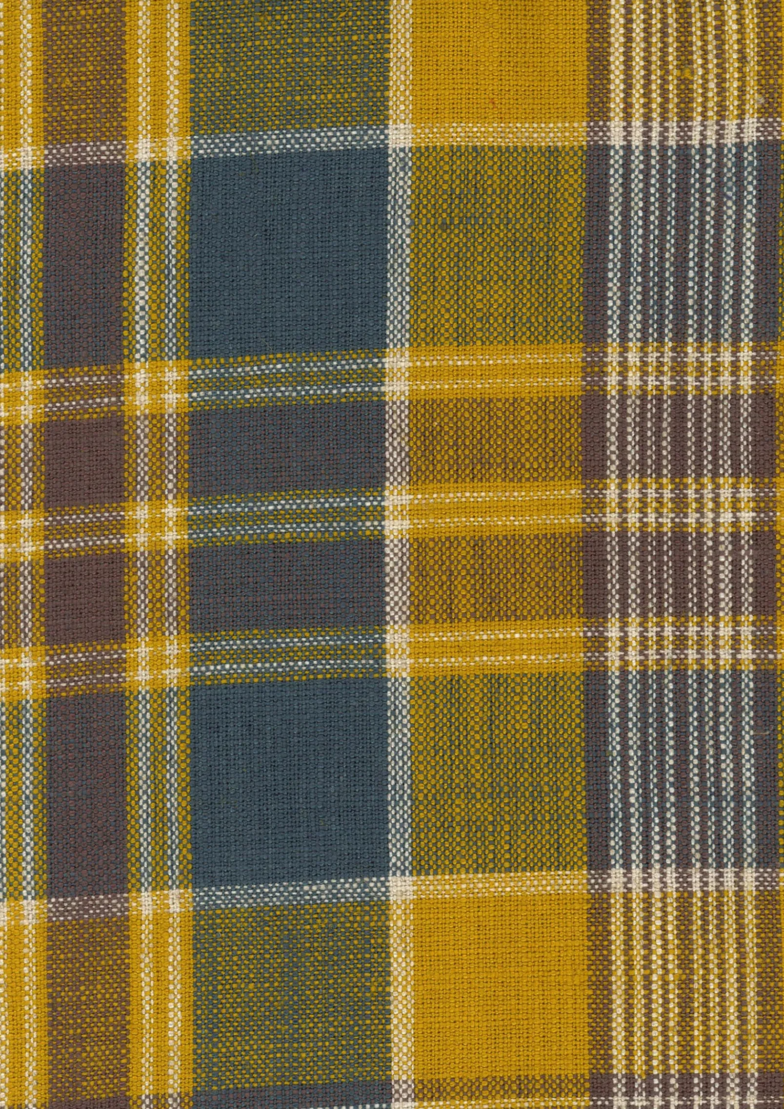 El tejido Multichess Curry de Coordonné es un diseño geométrico en amarillo/naranja de la colección Piccadilly.