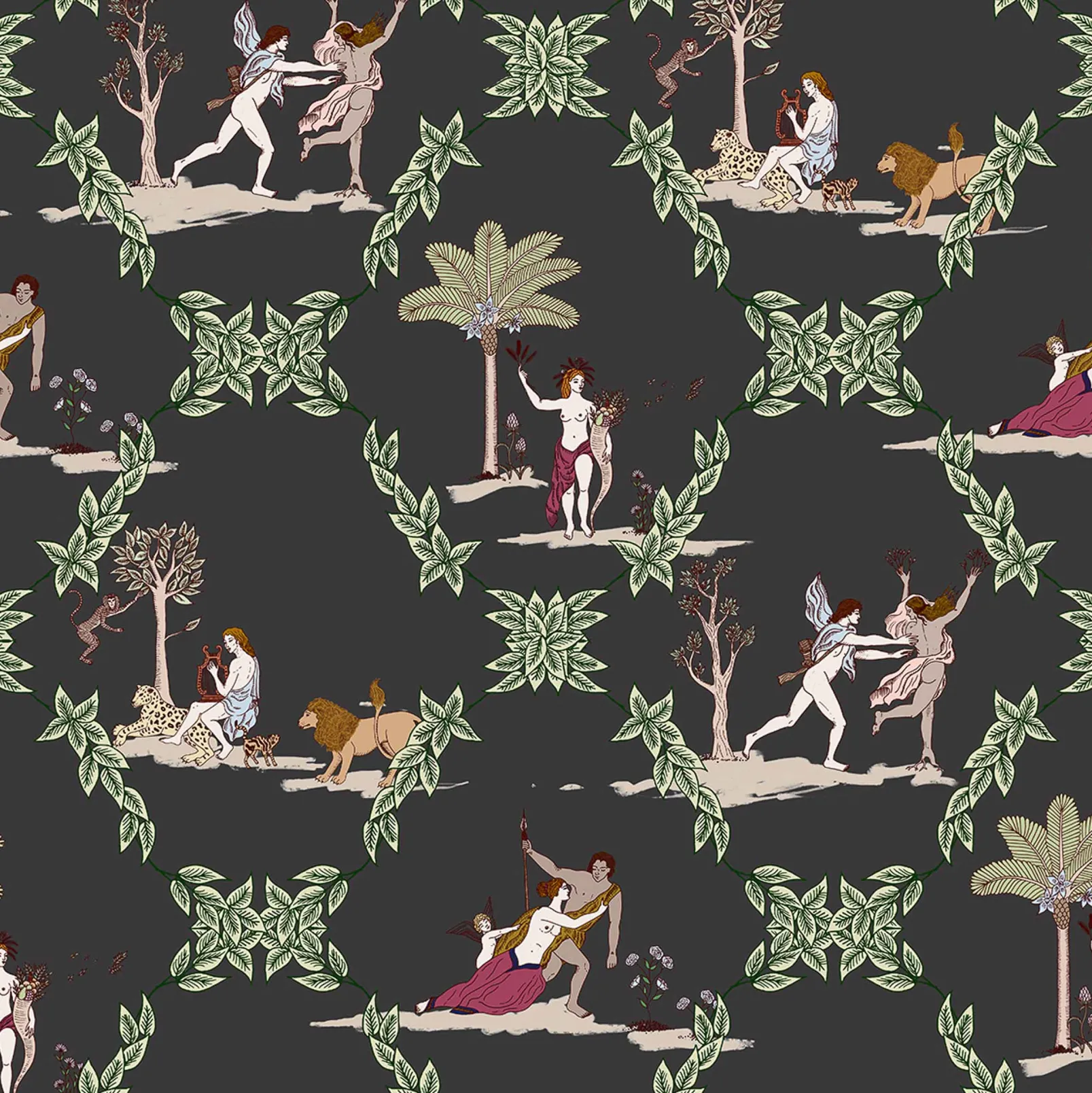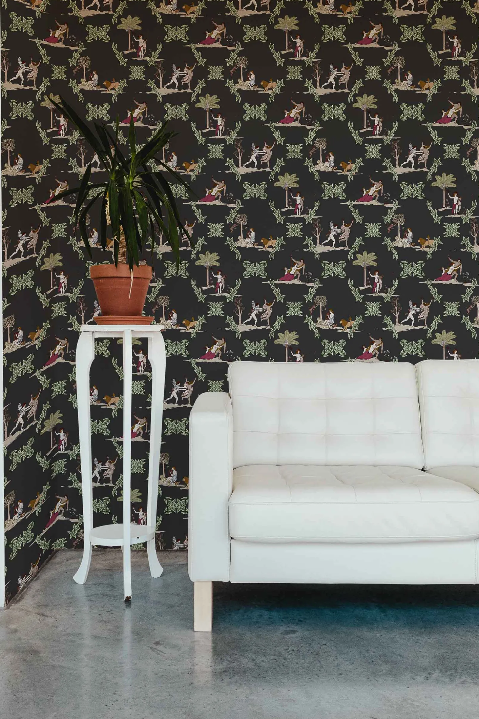 El papel pintado Neobucolic Black de Coordonné es un pueblo diseñado en tonos negros de la colección Metamorphosis.