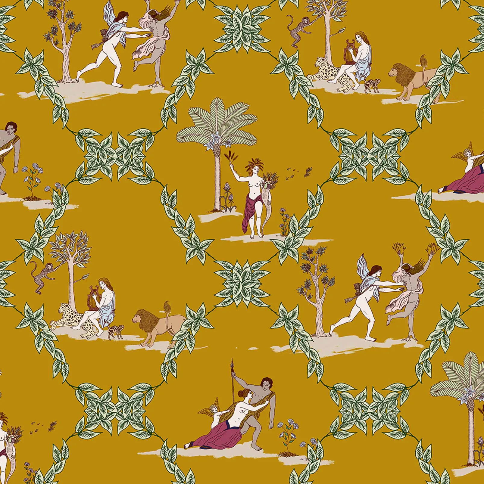 El papel pintado Neobucolic Mustard de Coordonné es un pueblo diseñado en tonos amarillo/naranja de la colección Metamorphosis.
