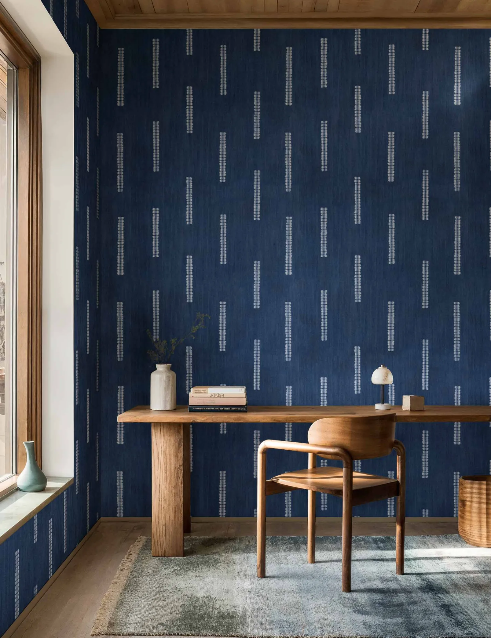 Nui Indigo de Coordonné es un diseño de rayas en azul/azul marino de la colección Shibori. La constante intermitencia del tiempo.