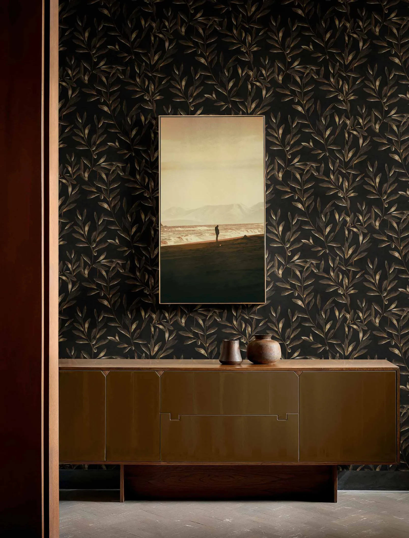 El carbón Olivetum de Coordonné es un diseño vegetal en negro de la colección Pompei. Ramas rebosantes de aceitunas que extienden sus brazos para saludar el paso de los siglos.