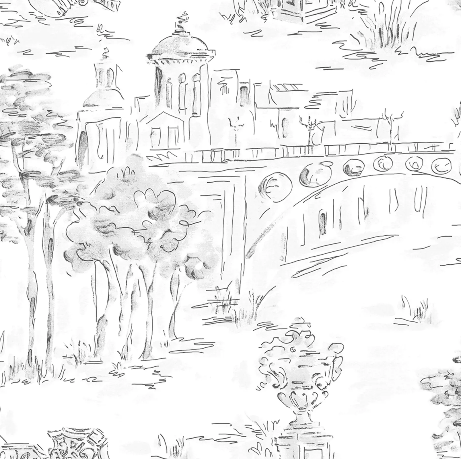 El papel pintado Paisaje Plata de Coordonné es un diseño de paisaje en tonos blancos/grises de la colección Toscana.