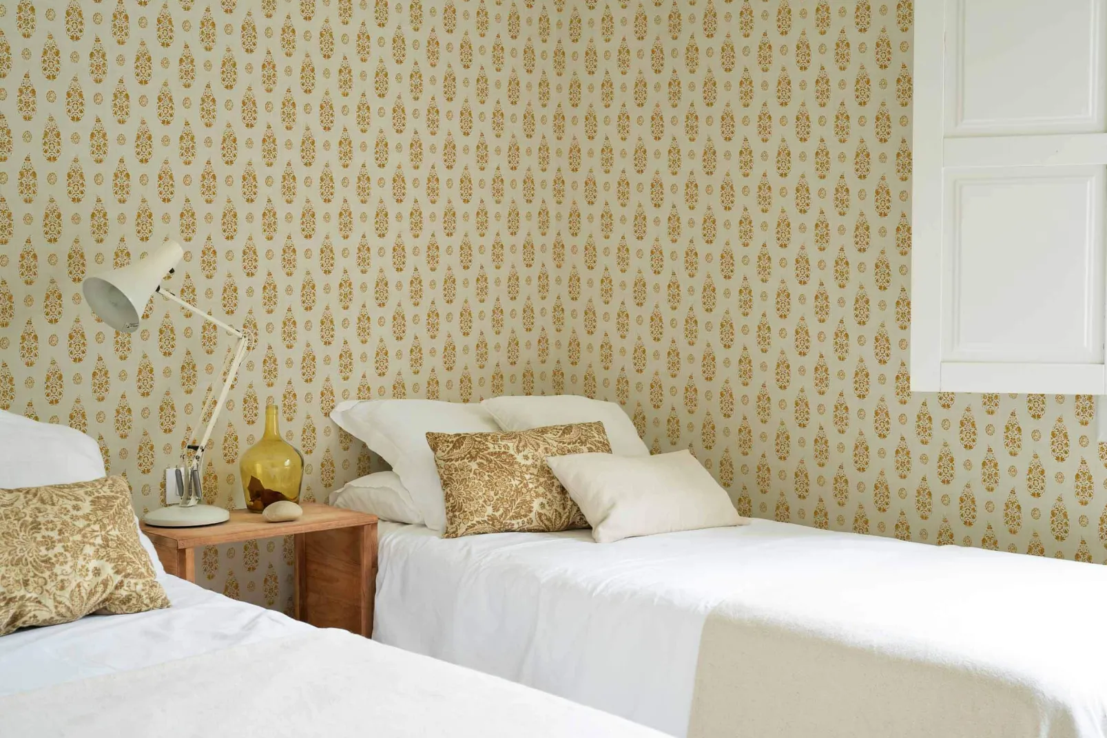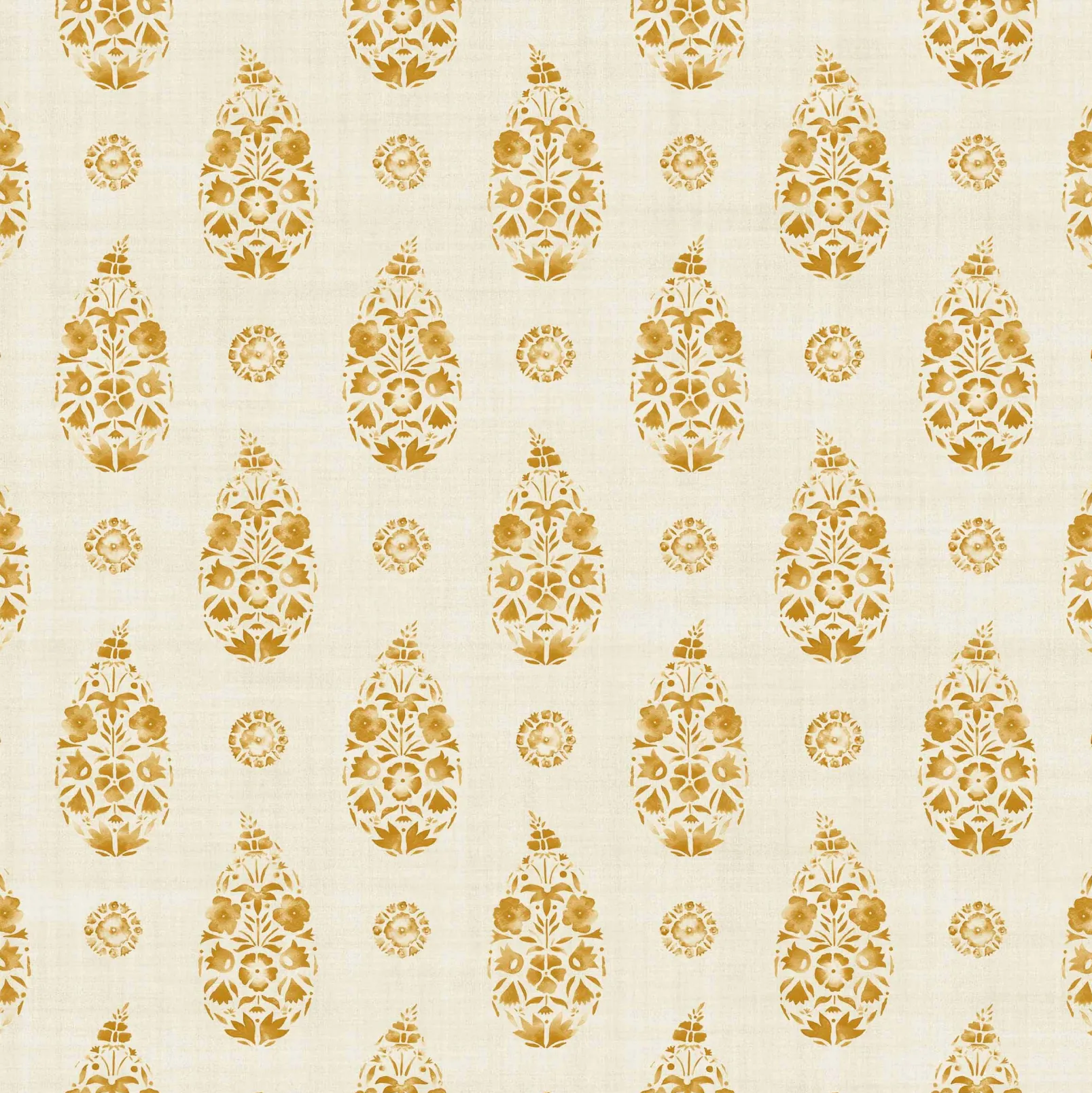 Paisley Curry de Coordonné es un papel pintado de inspiración vegetal en color Amarillo/Naranja. Formas de lágrimas únicas que buscan universos paralelos.