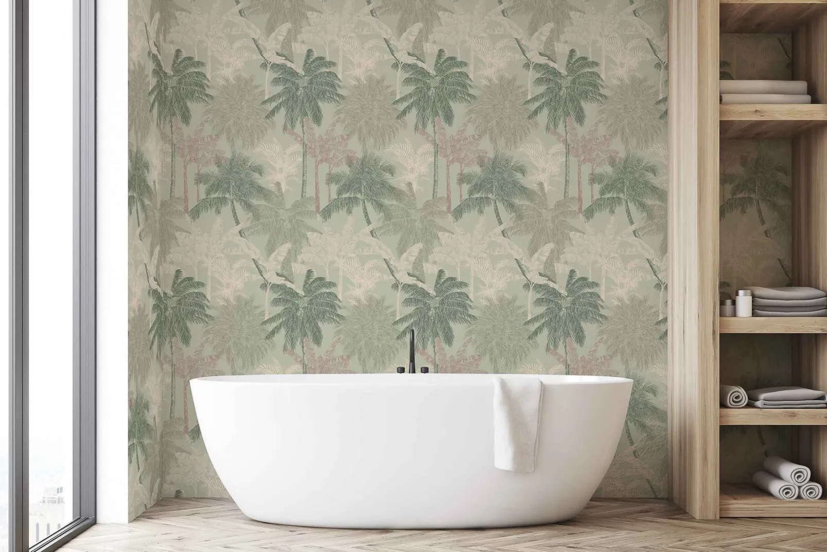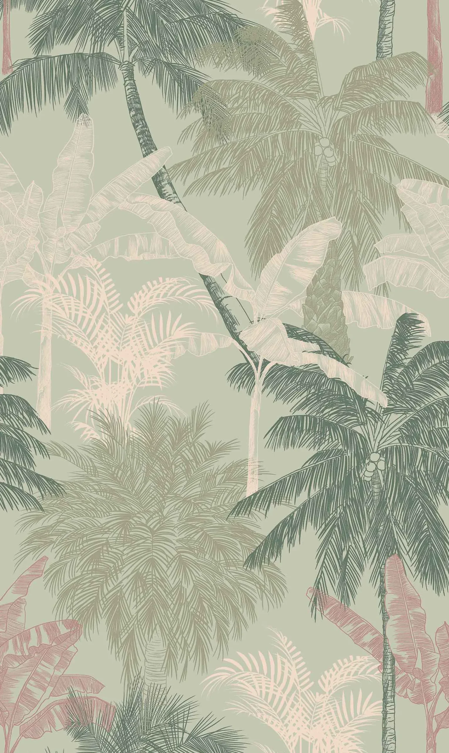 El papel pintado Palms Menta de Coordonné es un diseño vegetal en tonos verdes de la colección Brasil.