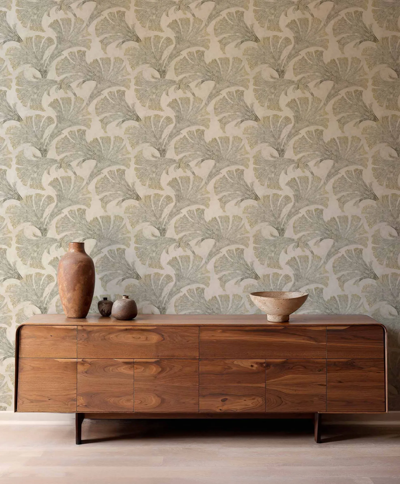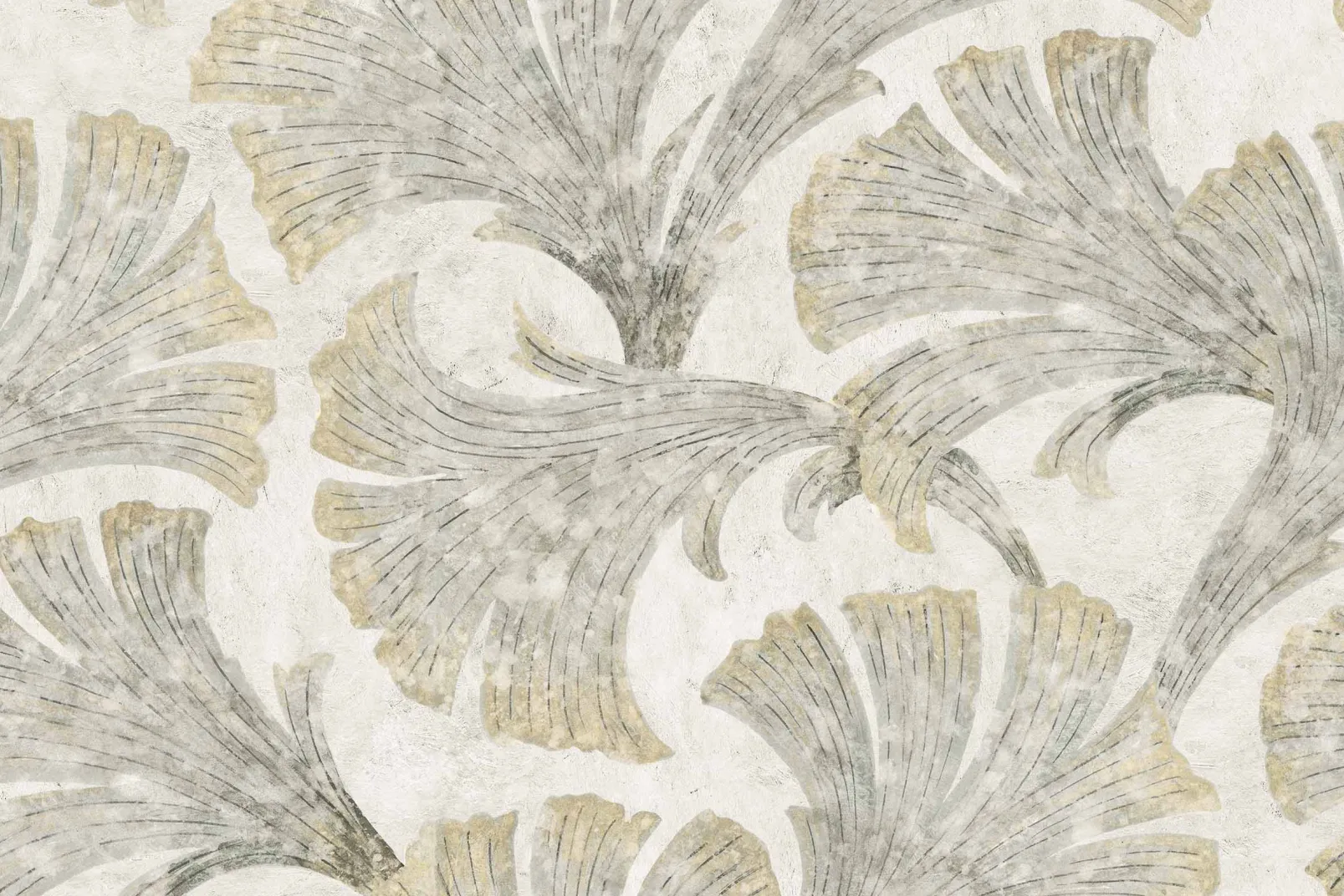 Papyrus Nacre de Coordonné es un diseño vegetal en blanco/gris de la colección Pompei. Vestigios de plumas oscilantes rescatados de los muros estucados de un palacio romano.