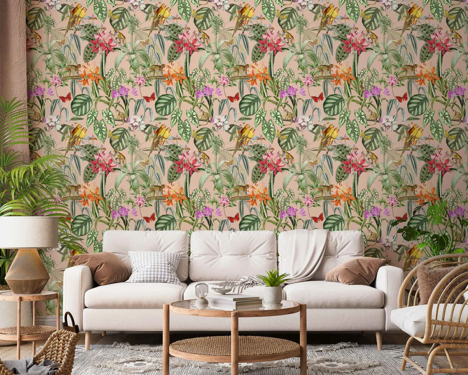 Papel pintado Parrots Melocotón de Coordonné en un animal diseñado en tonos rosa/lila de la colección Brasil.