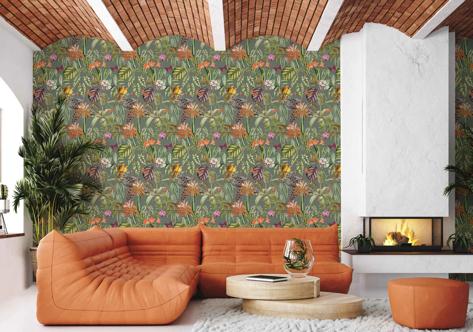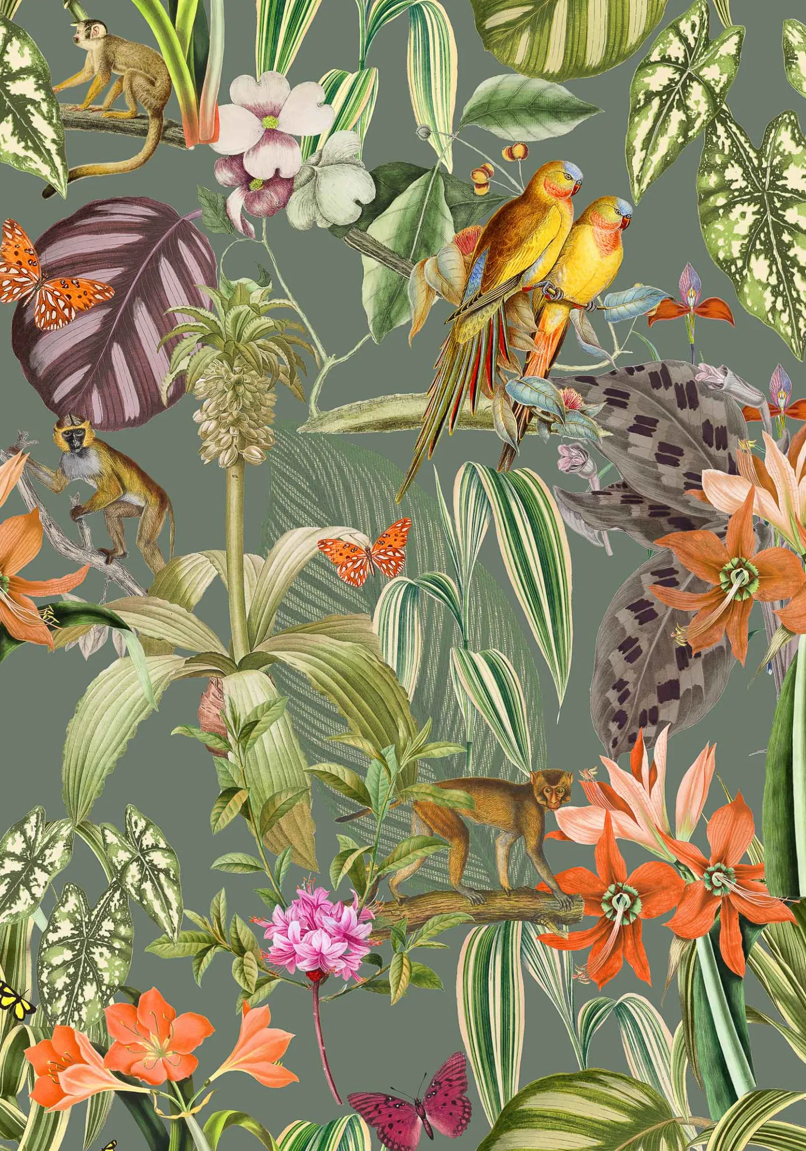 Papel pintado Musgo Parrots de Coordonné en un animal diseñado en tonos verdes de la colección Brasil.