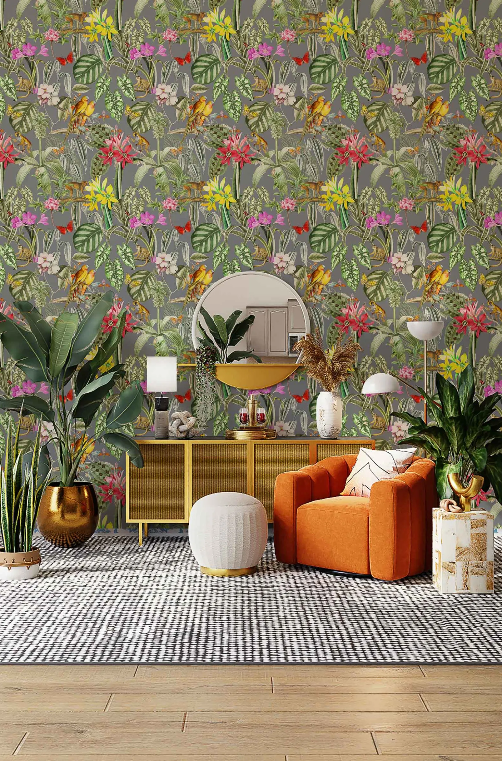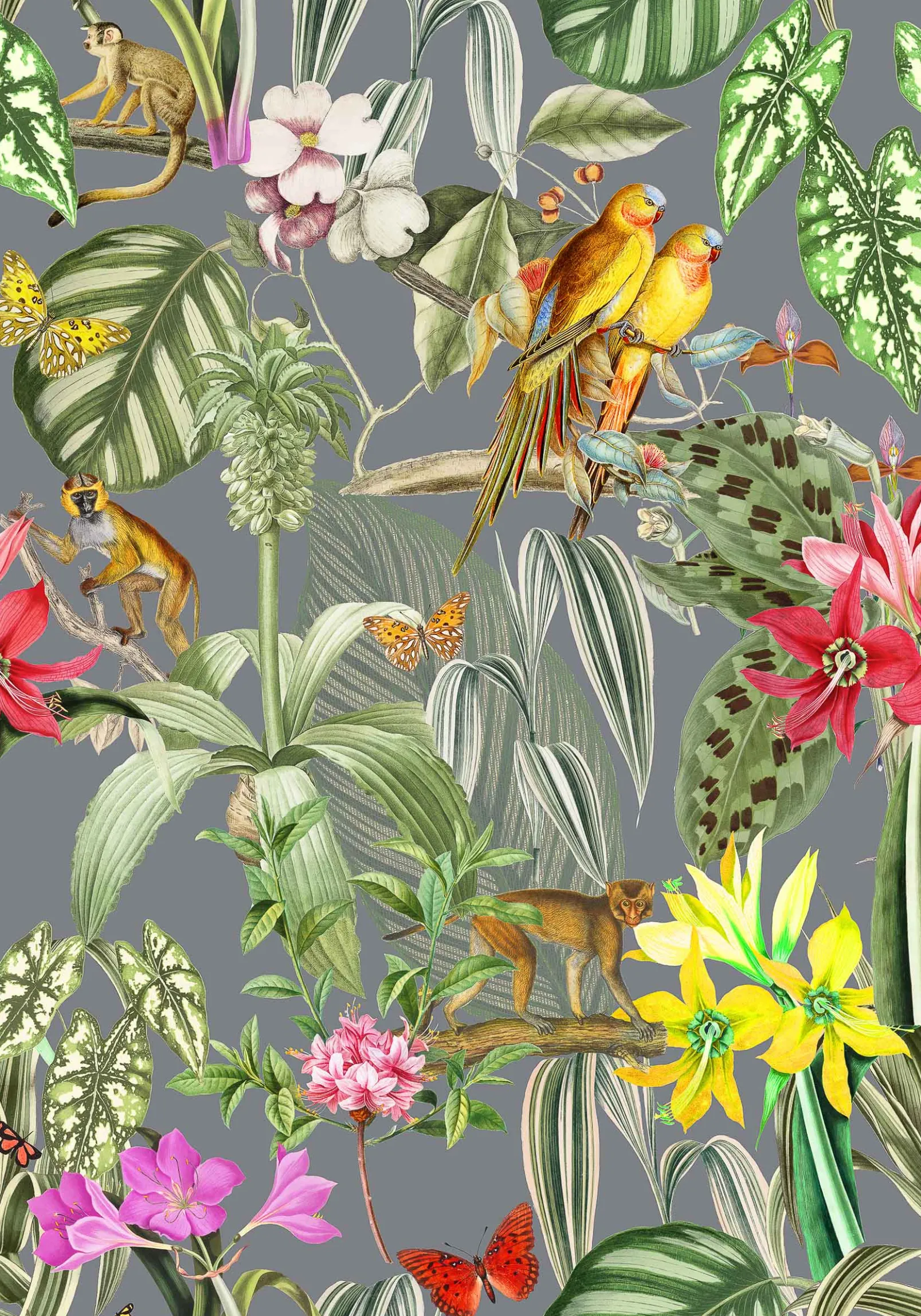 Papel pintado Parrots Tormenta de Coordonné en un animal diseñado en tonos Blanco/Gris de la colección Brasil.