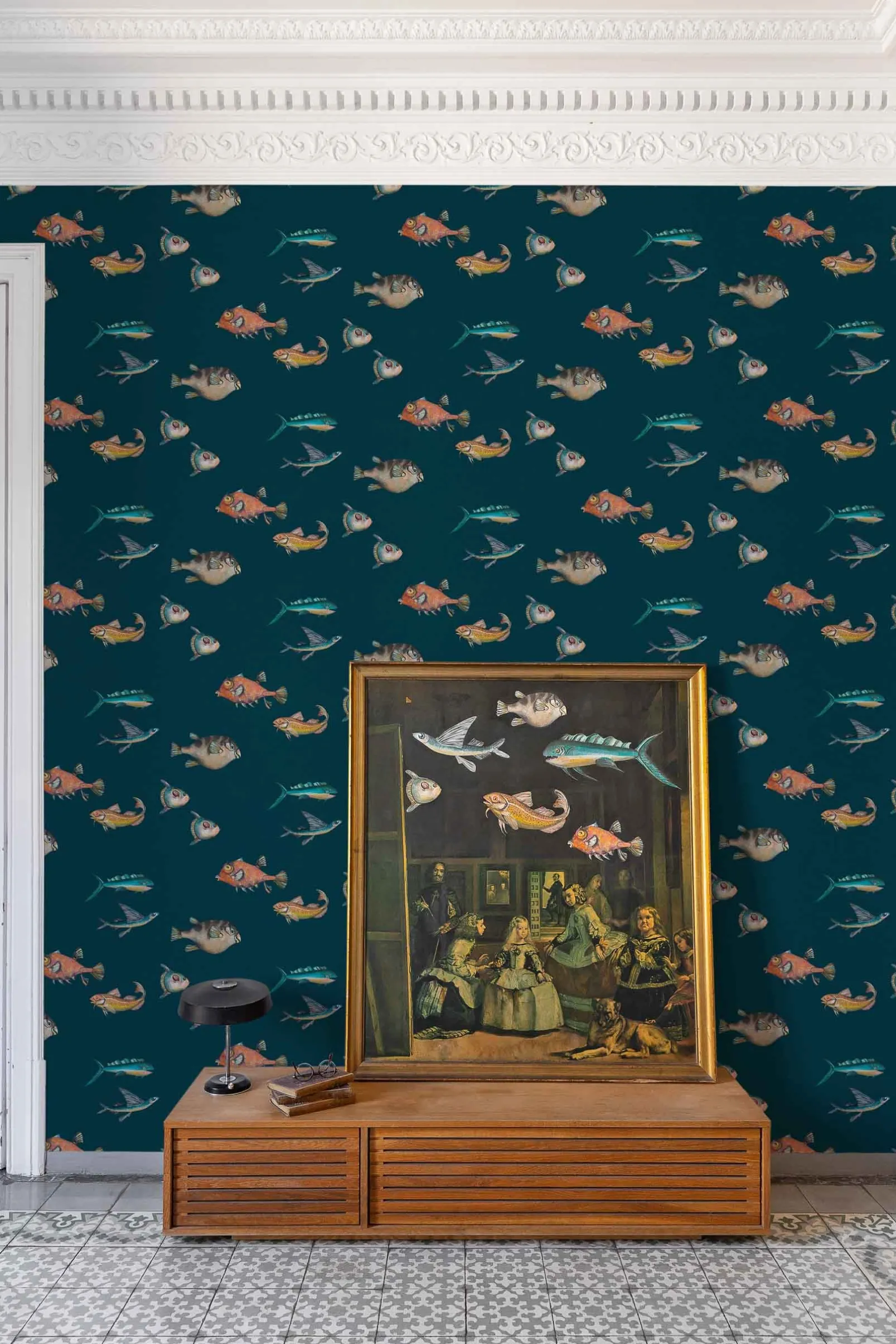 Papel pintado de Peces Santamans Marina Coordonné de la colección 40 aniversario con diseño de animales en tonos azules/marinos.