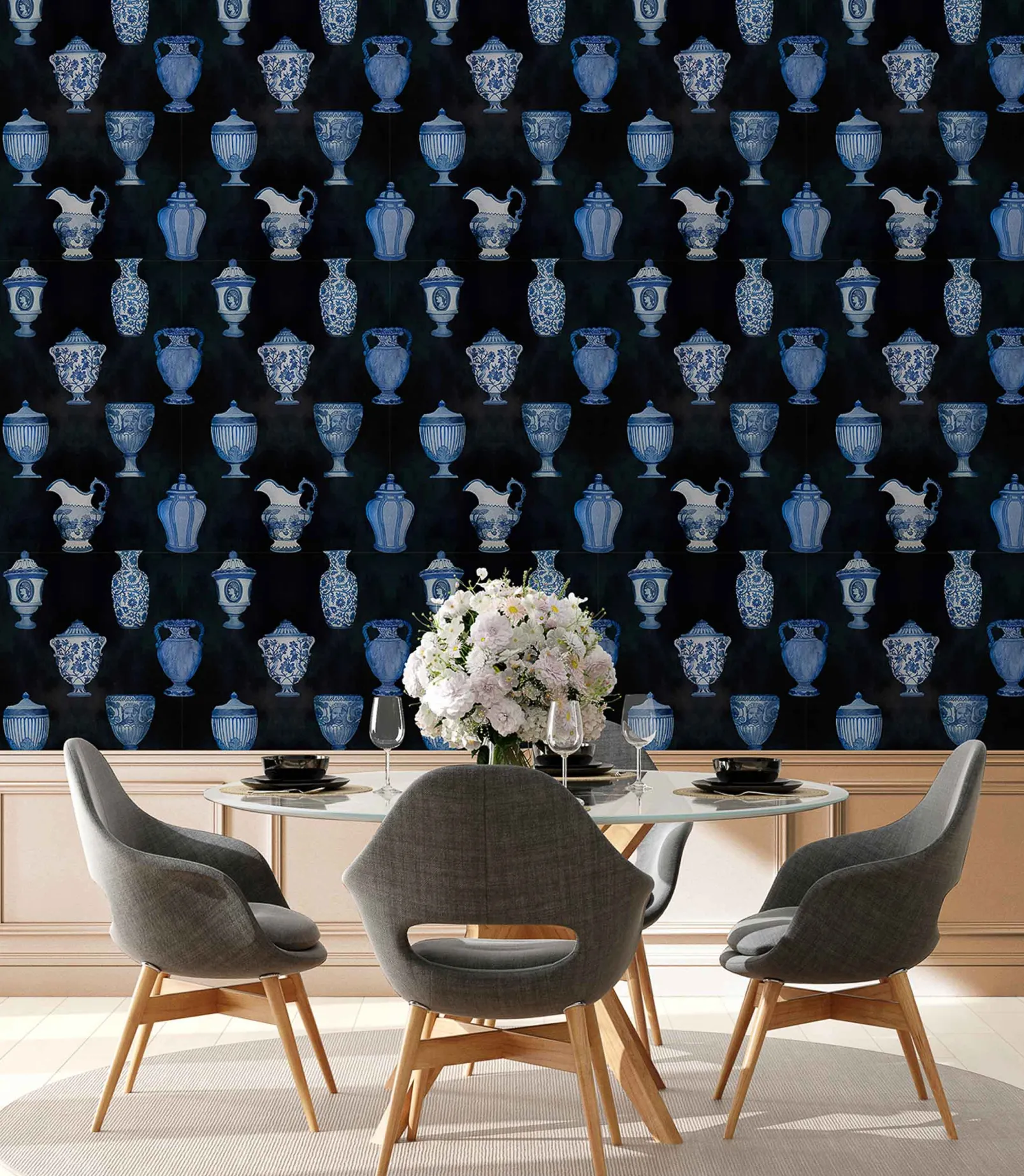 El papel pintado Porcelaine Marine de Coordonné es un diseño en tonos negros de la colección Maximalism.