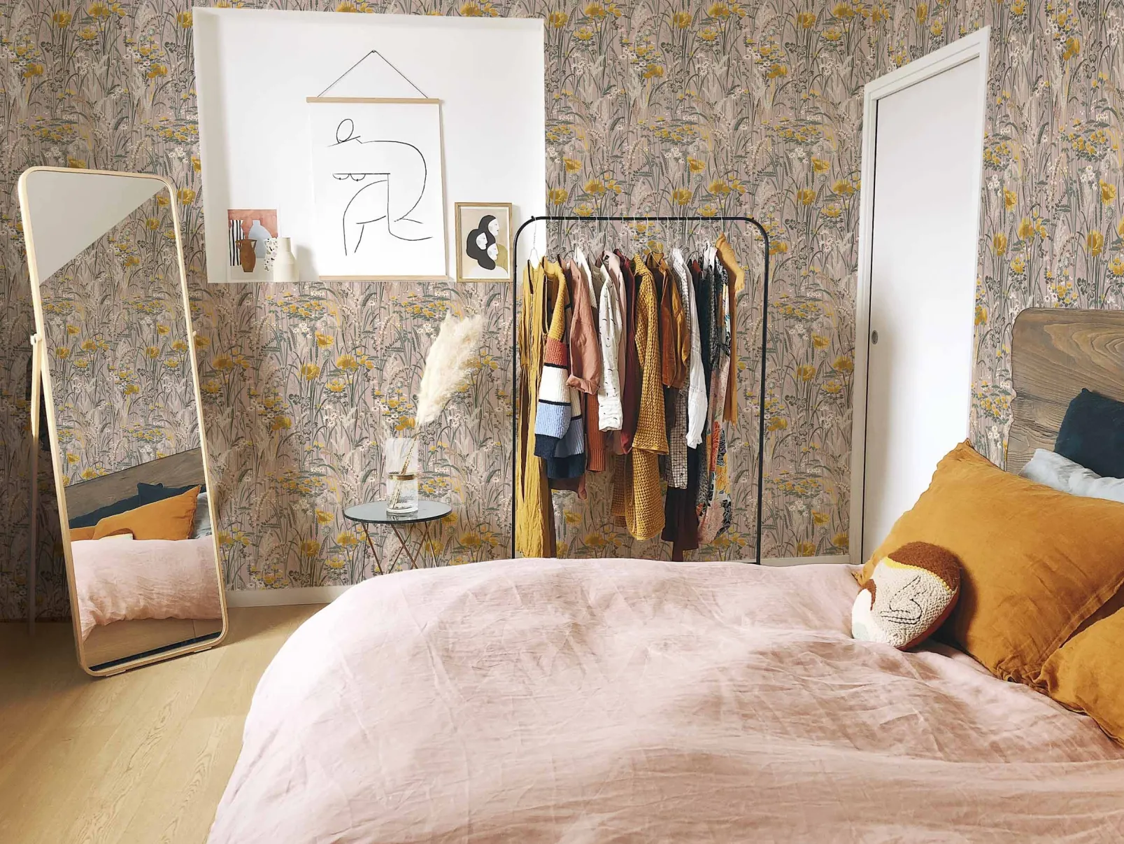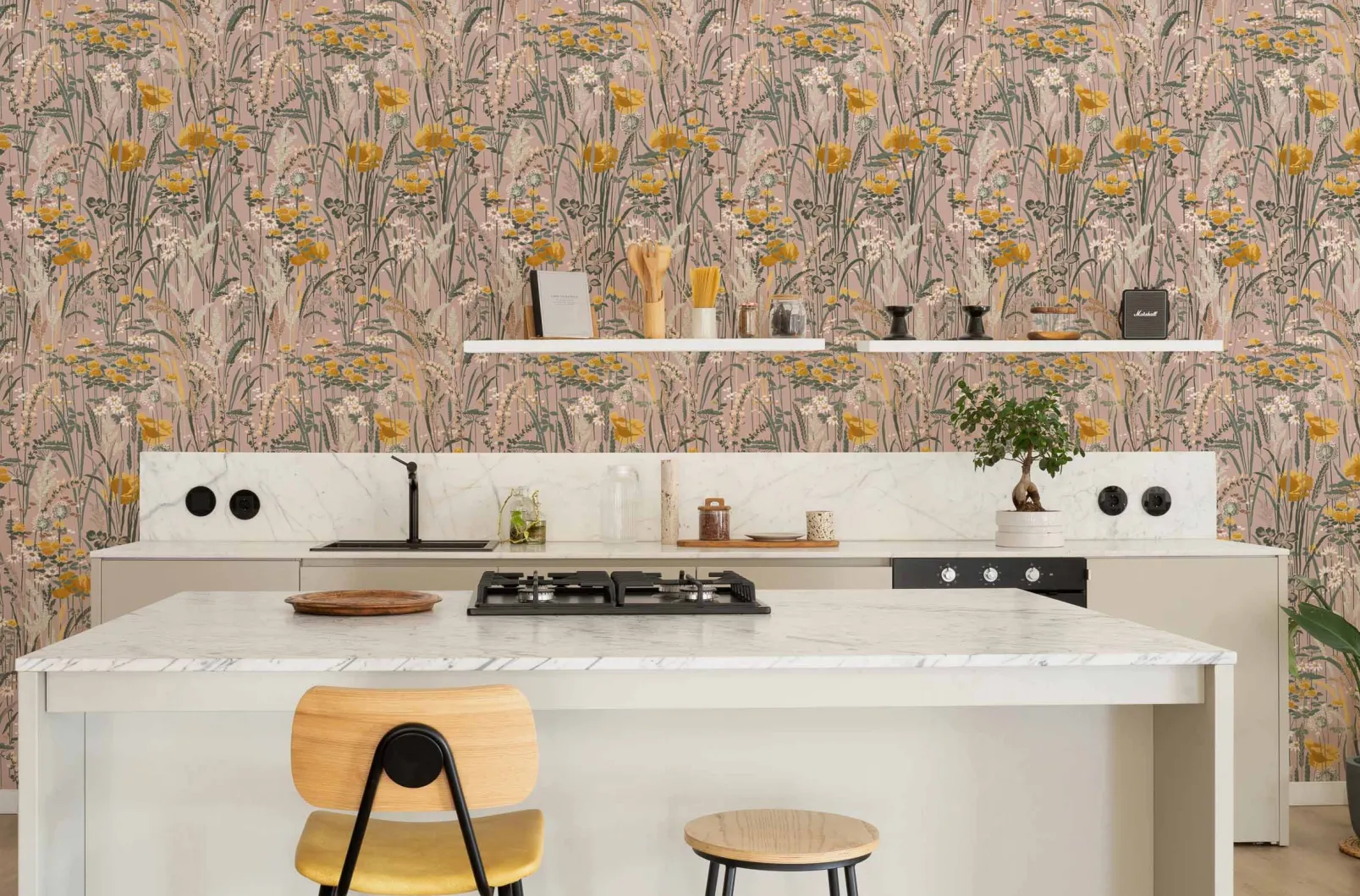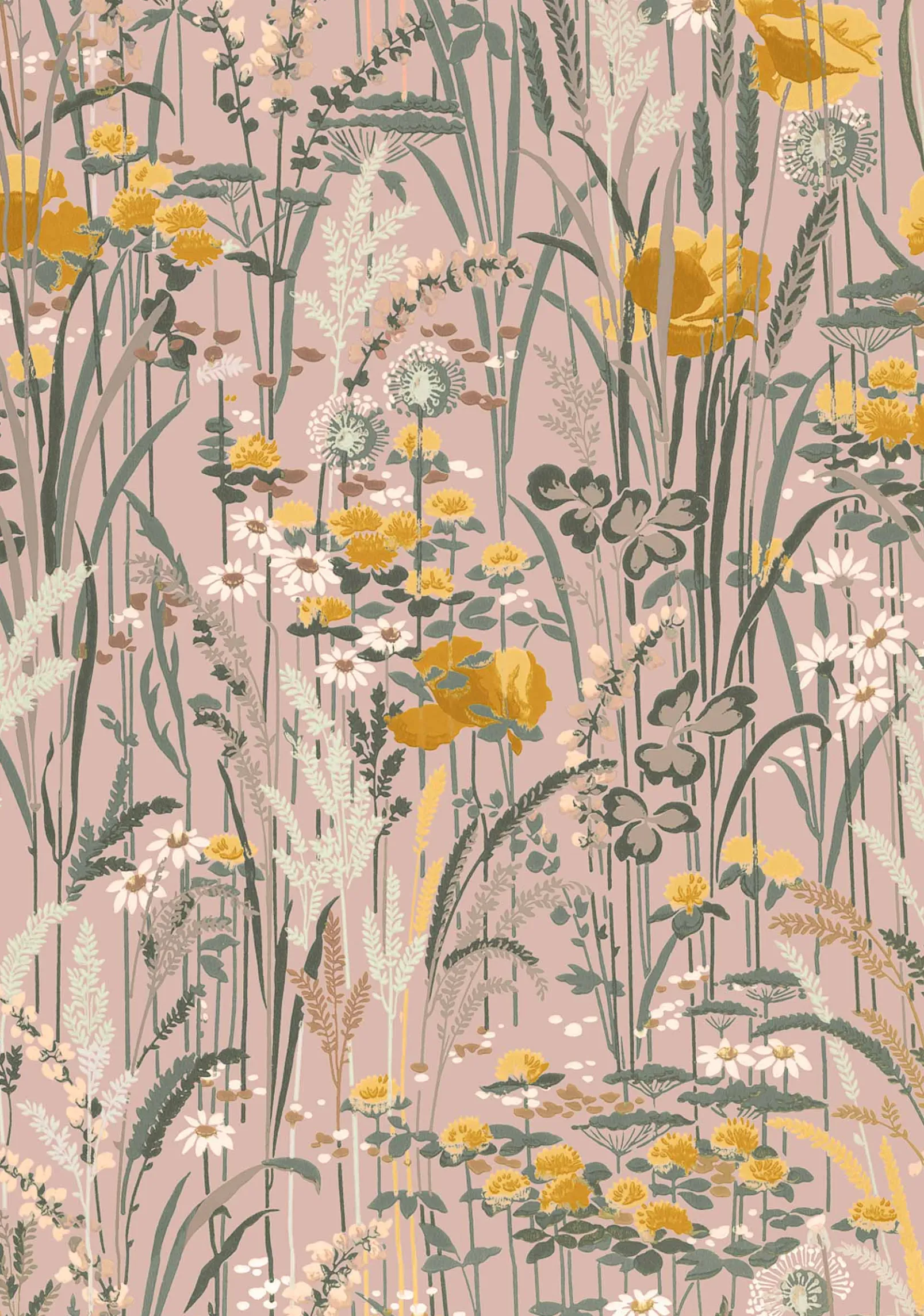El papel pintado Pradera Rosa de Coordonné es un diseño floral en tonos rosa/lila. Belleza espontánea de un prado cargado de amapolas y otras flores silvestres.