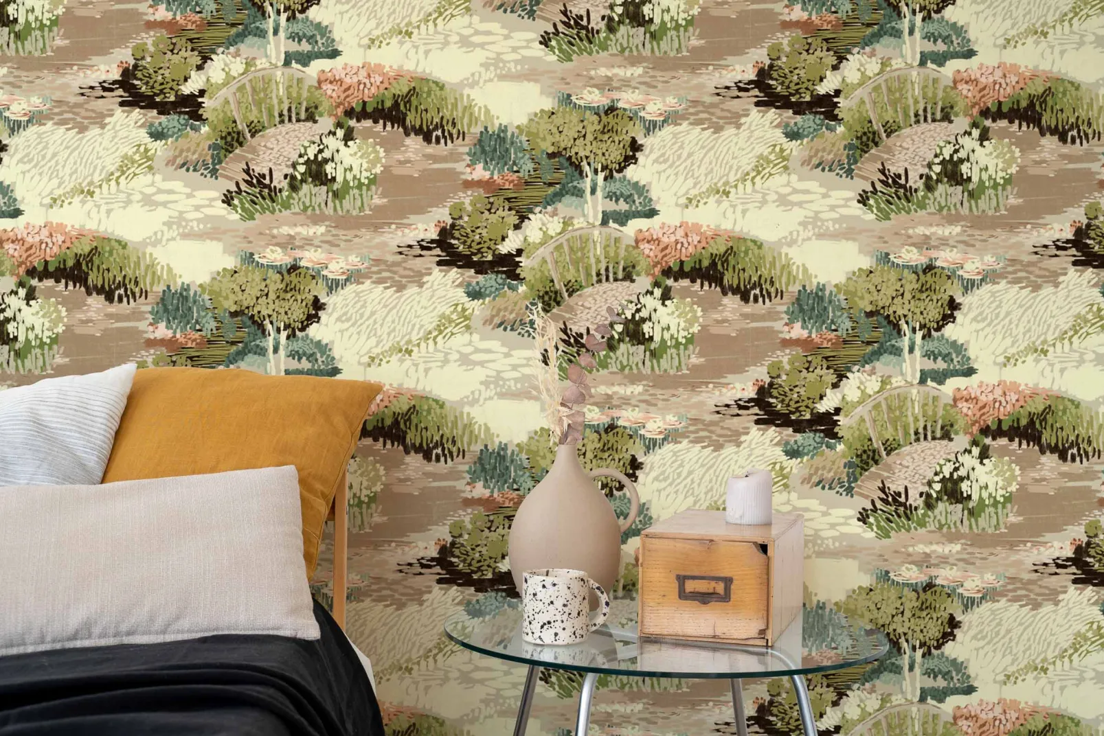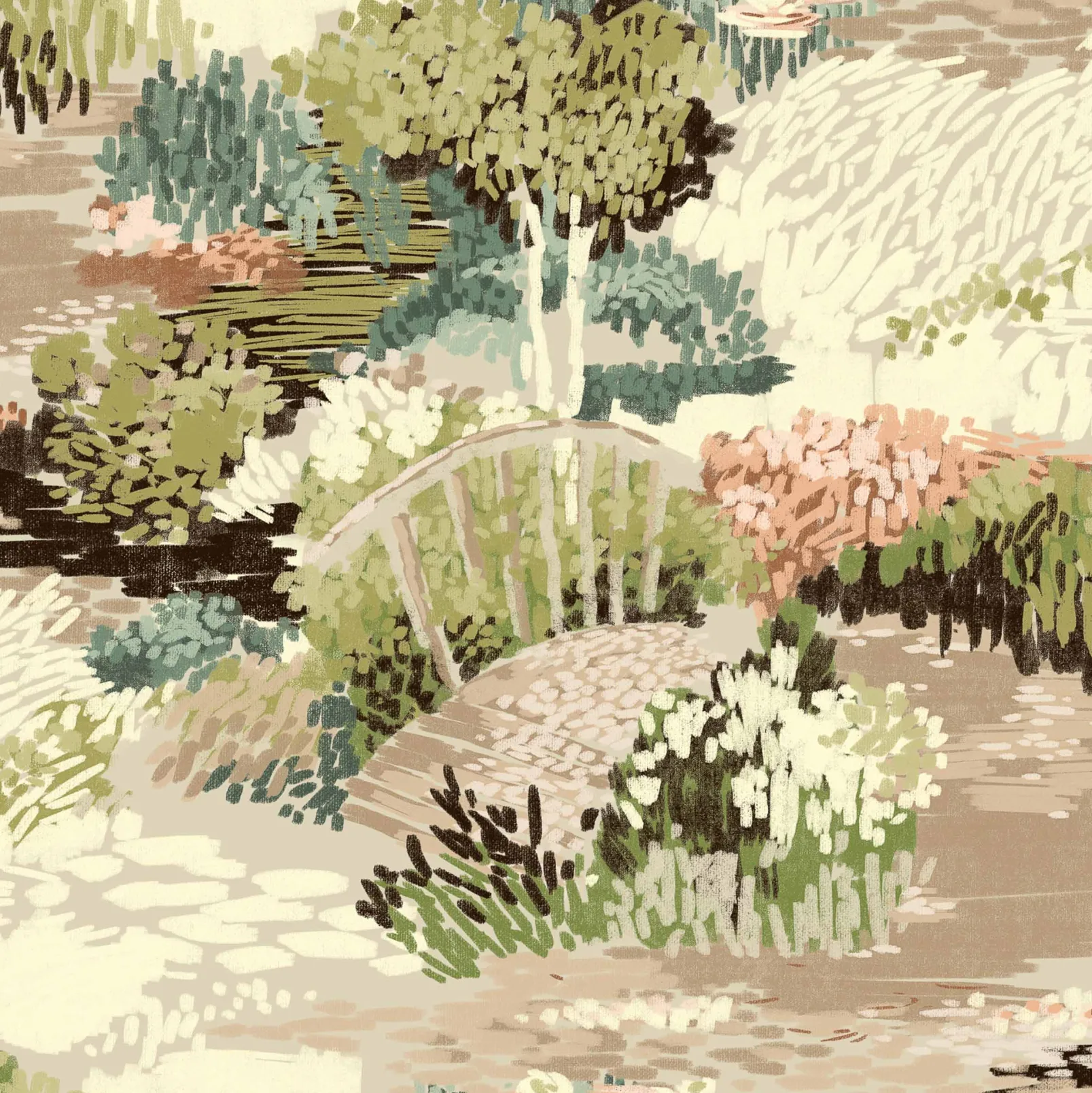 El papel pintado Puente Pistacho de Coordonné es un diseño vegetal en tonos verdes. Un entorno bucólico que habría captado toda la atención de Monet.